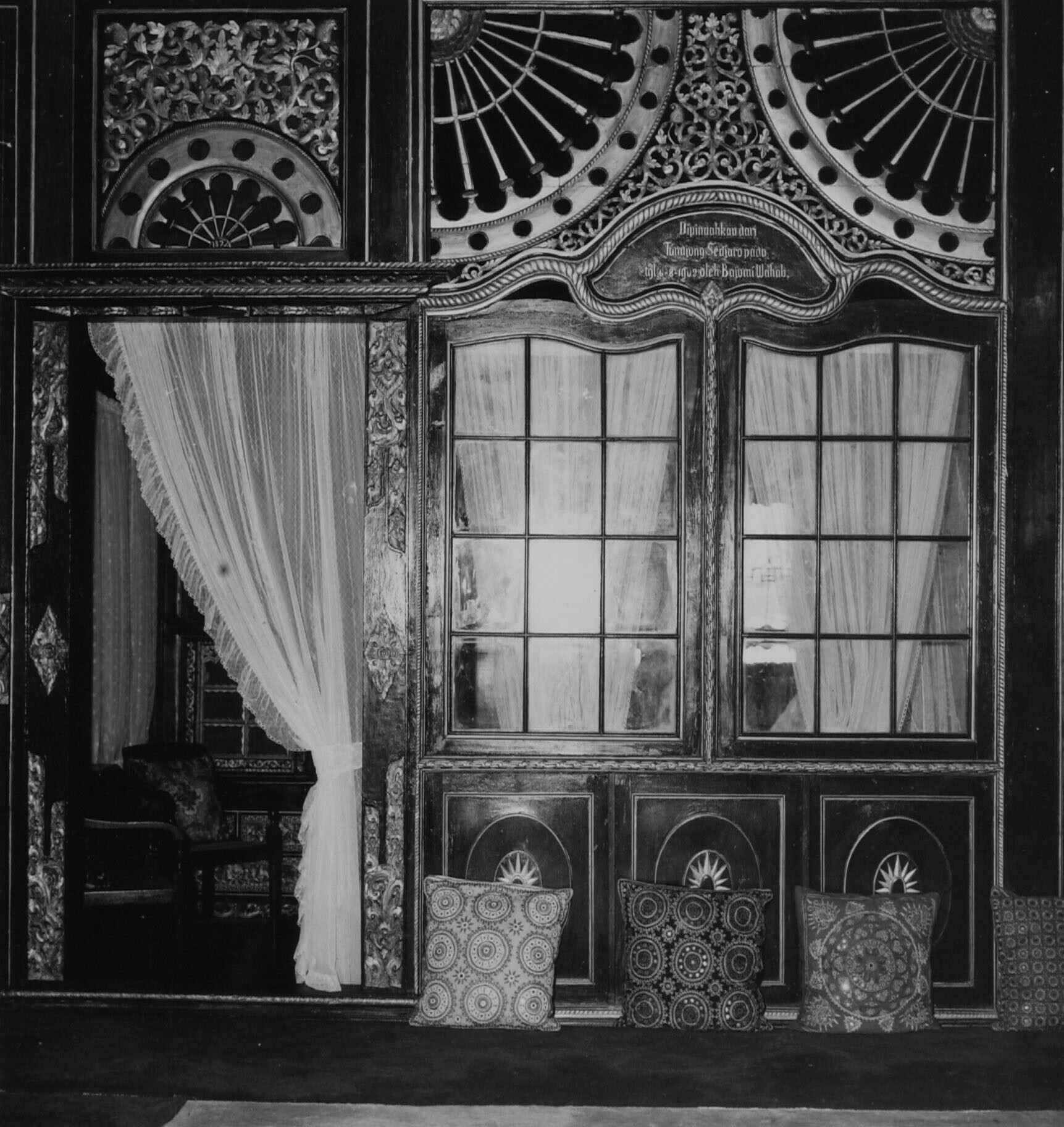 Het met houtsnijwerk versierde interieur in de woning van de zoon van prins Mohamed Nuch, Sajidah Bajumi Wahab