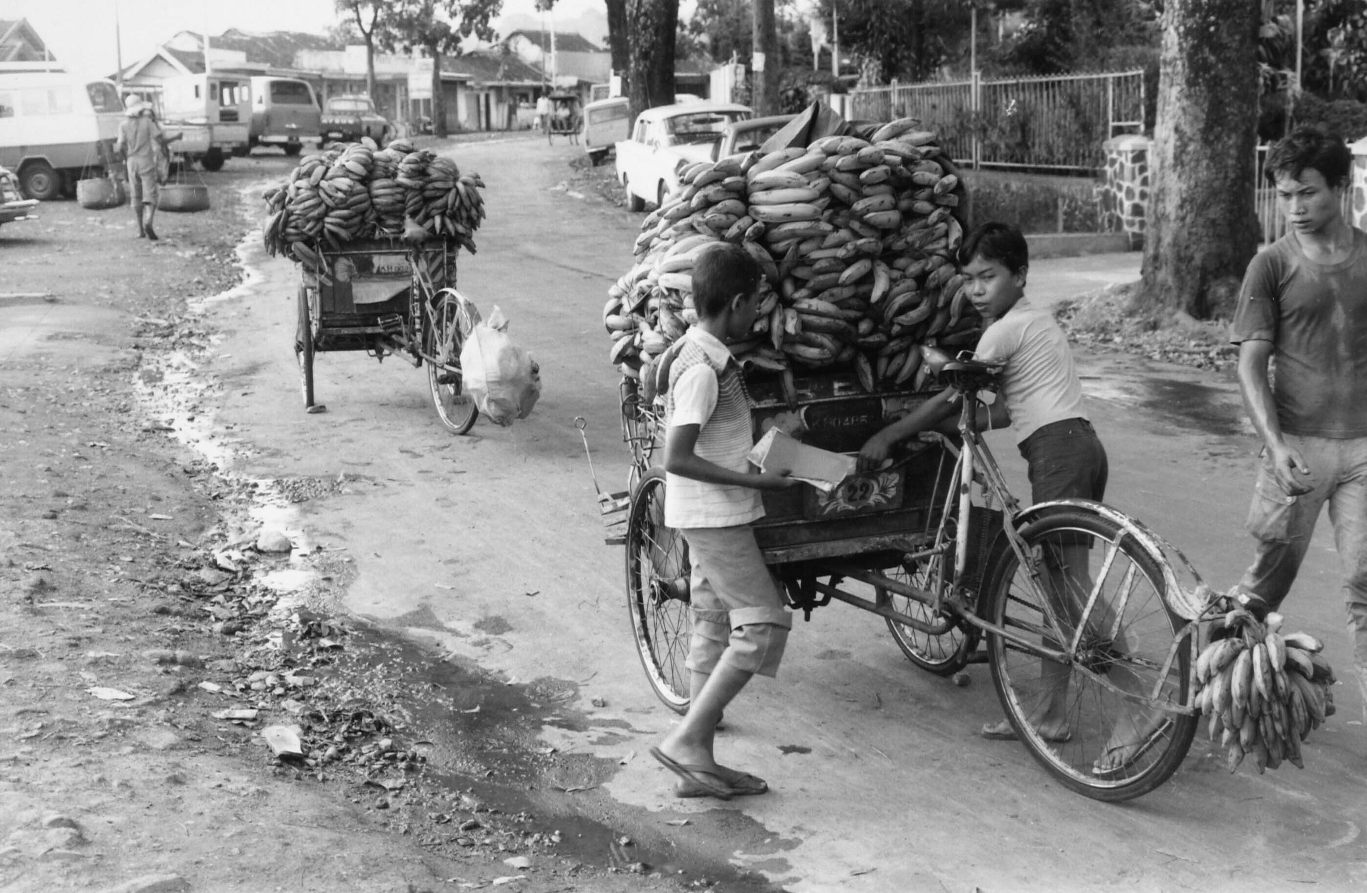 Jongens vervoeren bananen met een bakfiets