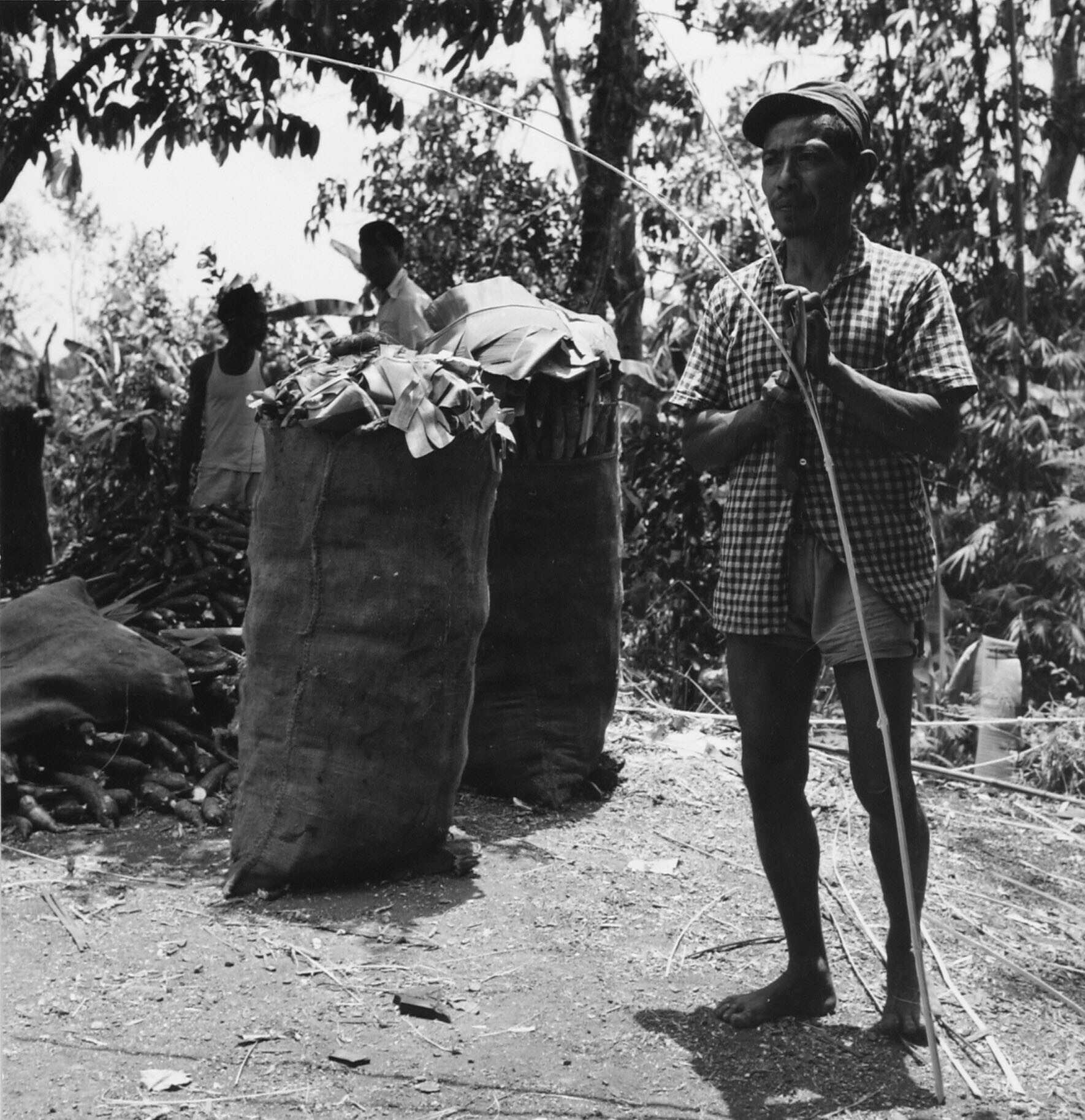 Een man snijdt repen bamboe die worden gebruikt om de in zakken verpakte cassaveoogst mee dicht te binden