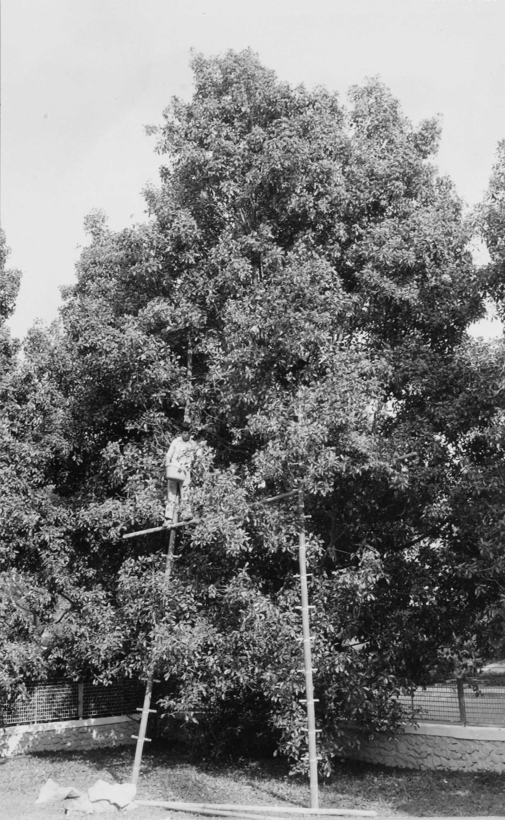 Het oogsten van ruim 30 jaar oude kruidnagelbomen in de tuin aan de Jalan Cimanak