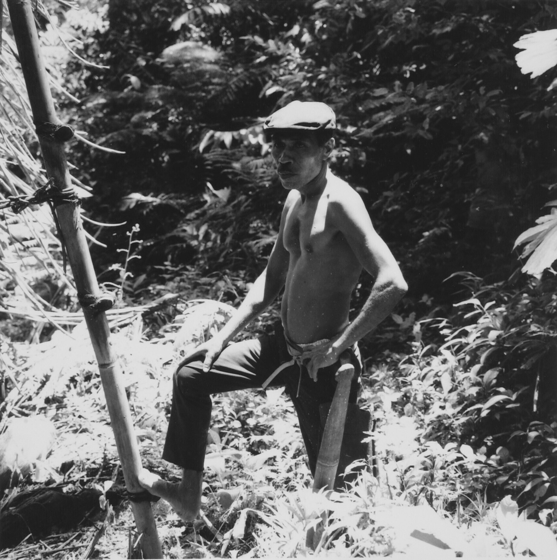 De helper van de suikertapper bij bamboeladder