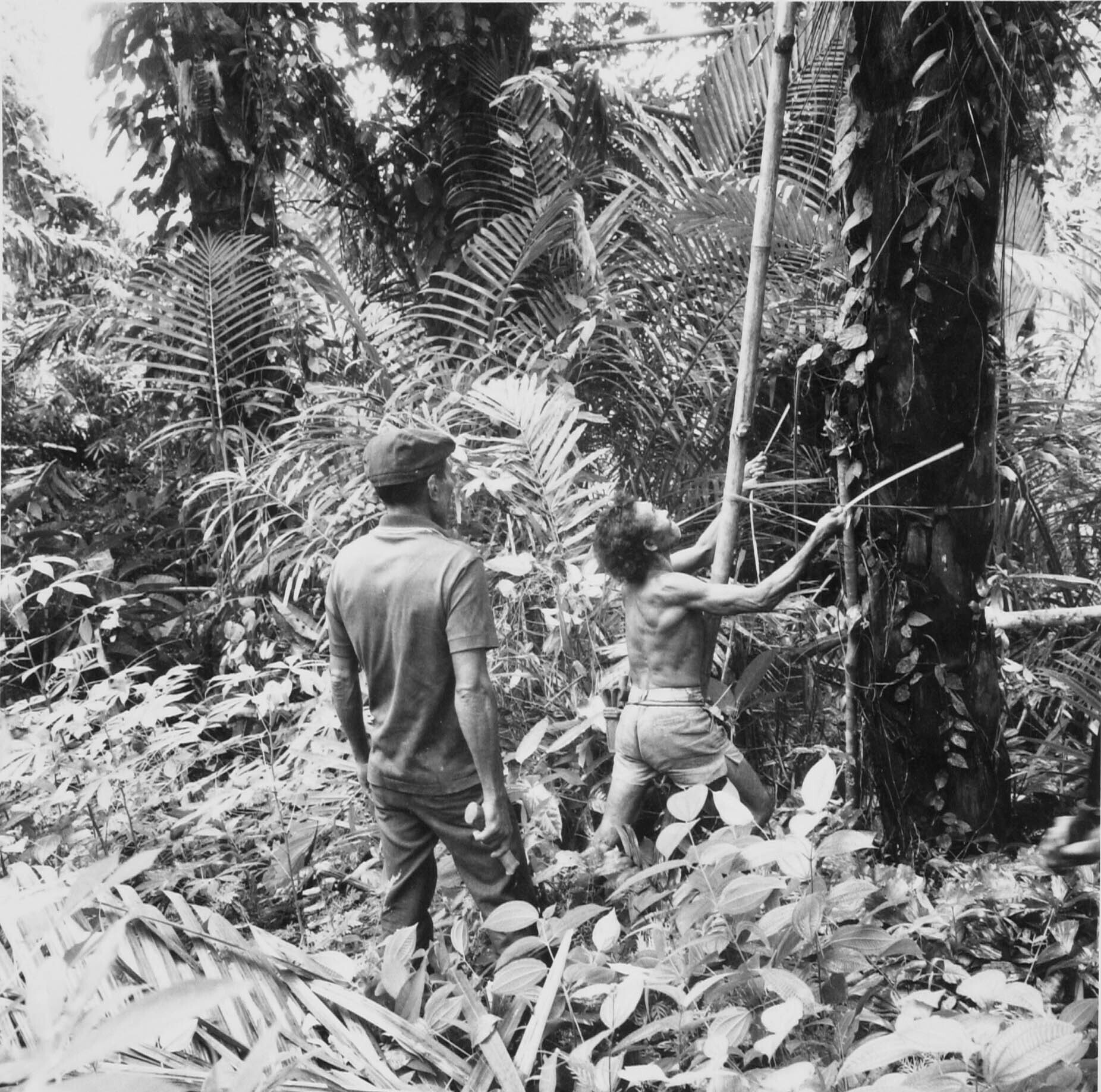 De suikertapper heeft een palm gevonden met een tapbare bloemtros d w z de knoppen staan op opengaan, hij bindt zijn ladder, een bamboe, met een stuk bast bast tegen de palm aan