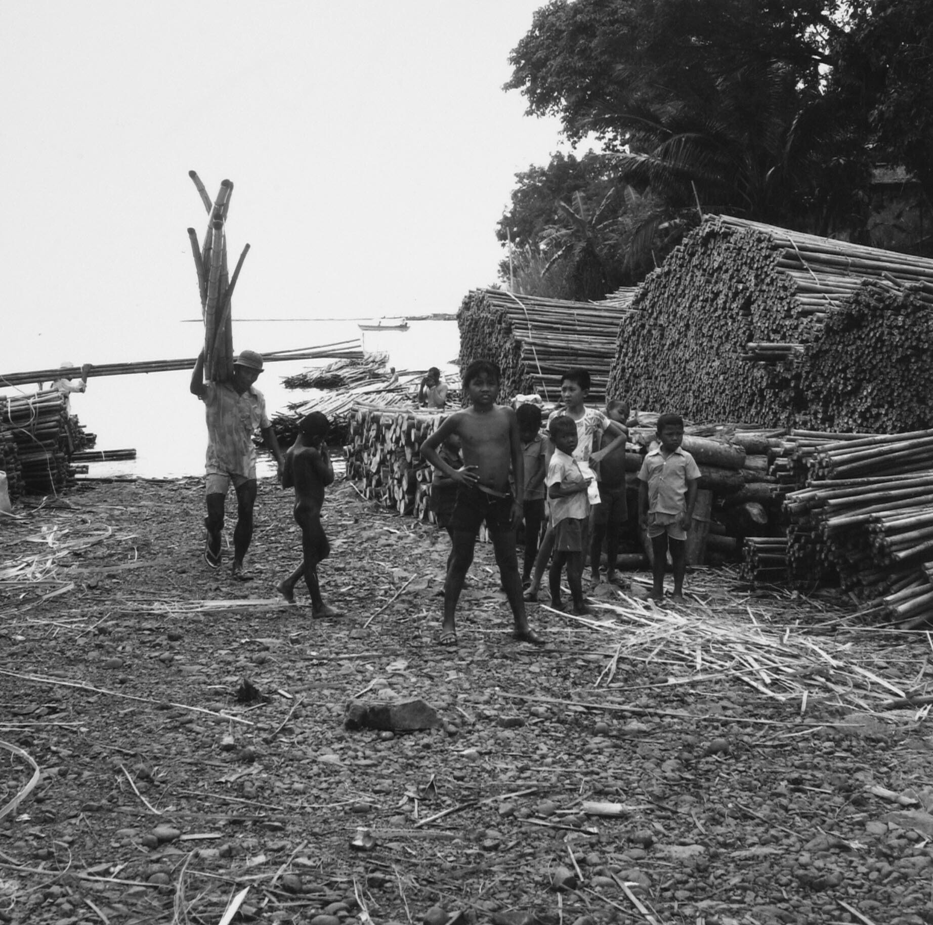 Het stapelen van de bamboe’s met op de achtergrond de aangevoerde bamboe vlotten