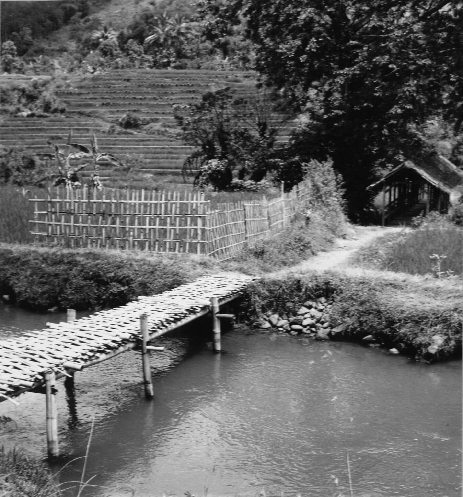 Bruggetje van gevochten bambulatten, op de achtergrond rijstterrassen