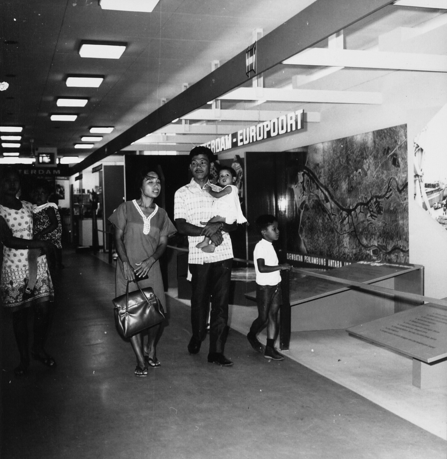 Een Indonesisch gezin wandelend langs de Nederlandse bijdrage op de Jakarta Fair