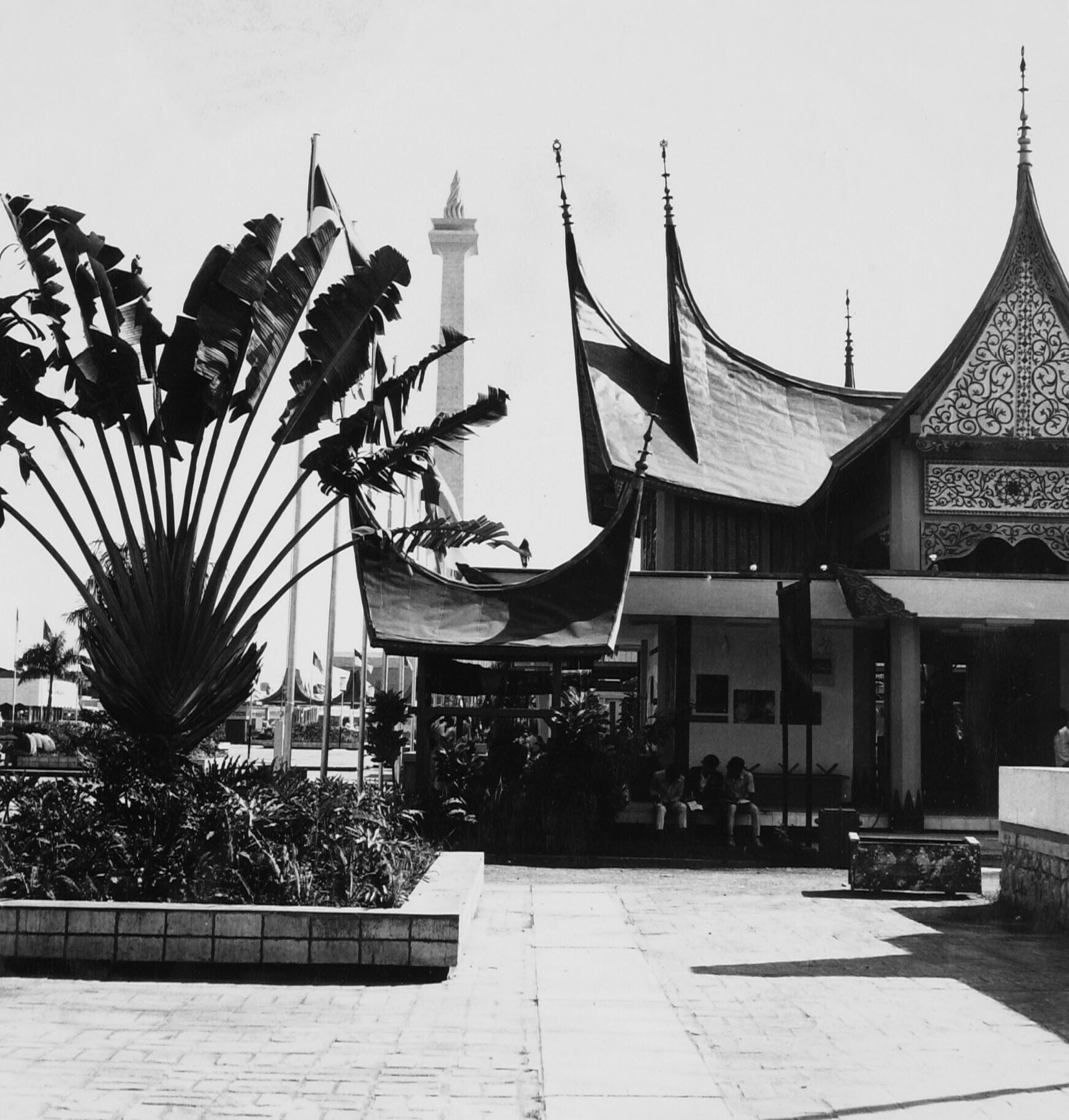 Rechts een gebouwencomplex met Menangkabause gevels op de Jakarta Fair