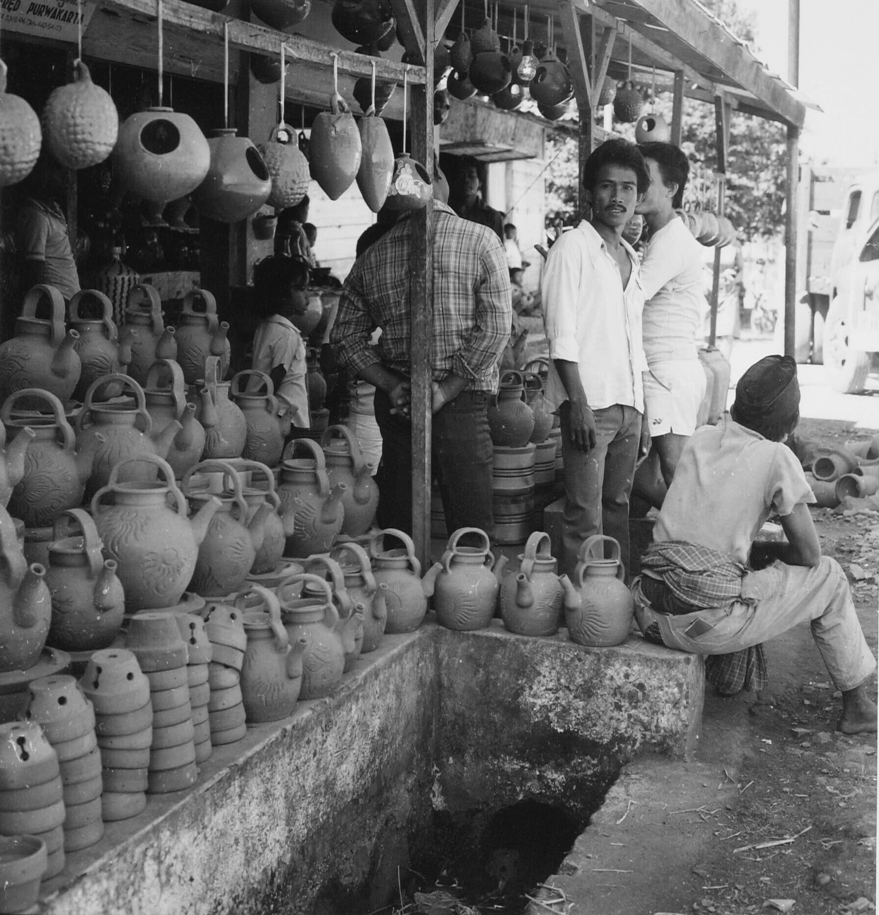Bloempotten, waterkannen en dieren van aardewerk in een winkel