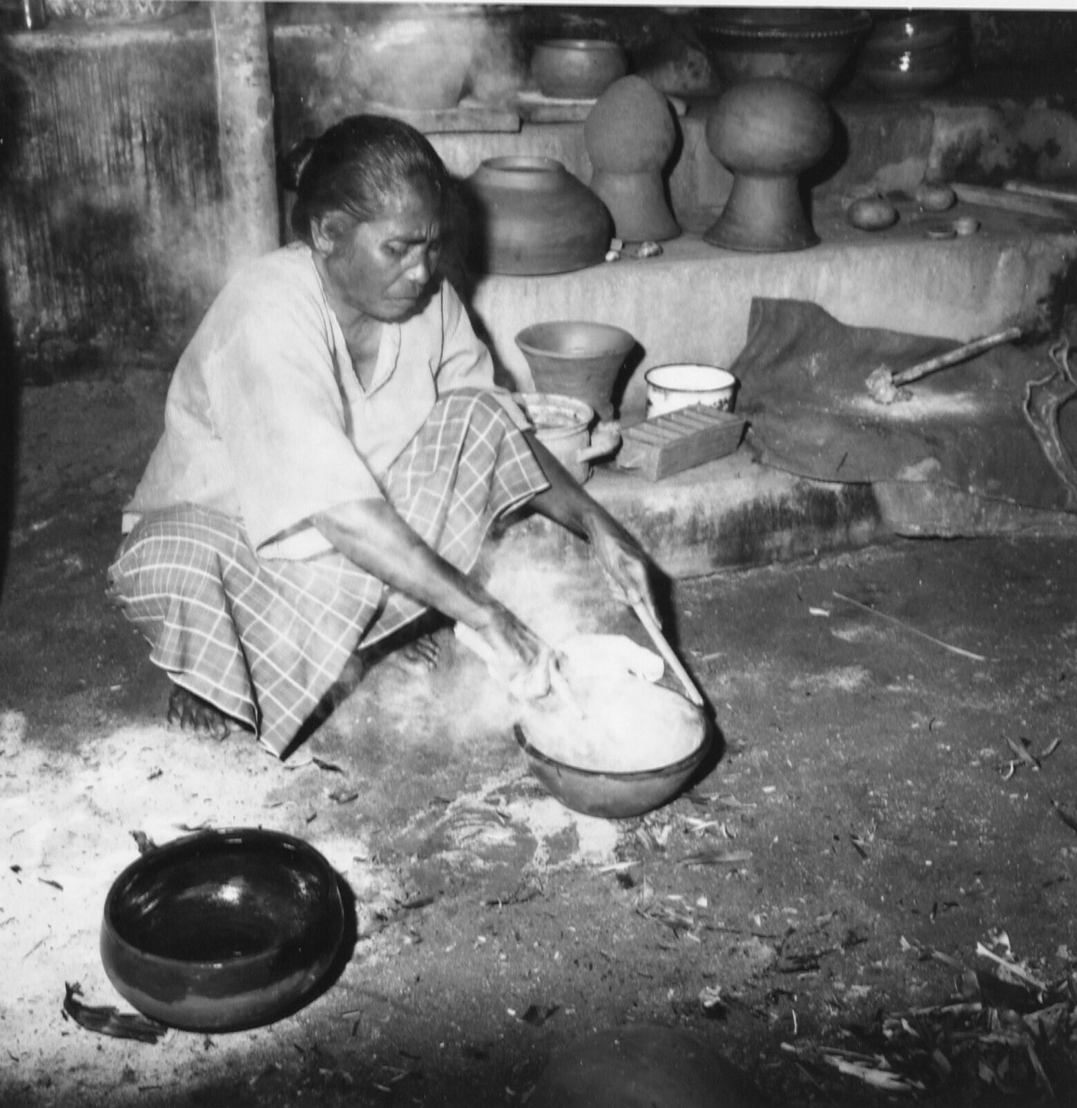 Een pottenbakster maakt met damarhars een pas gebakken aarden kom waterdicht, de schaal op de voorgrond is reeds met damar bewerkt