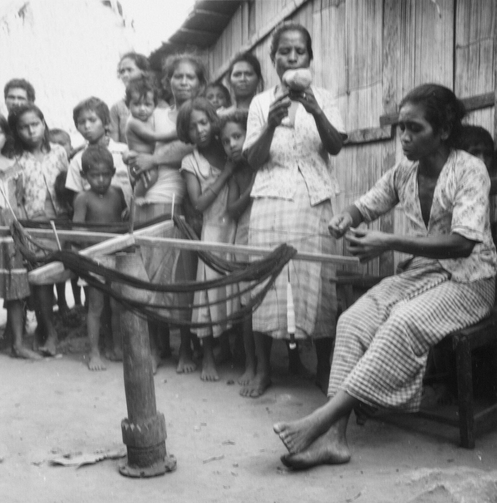 De geverfde garens worden tot een bol gewonden