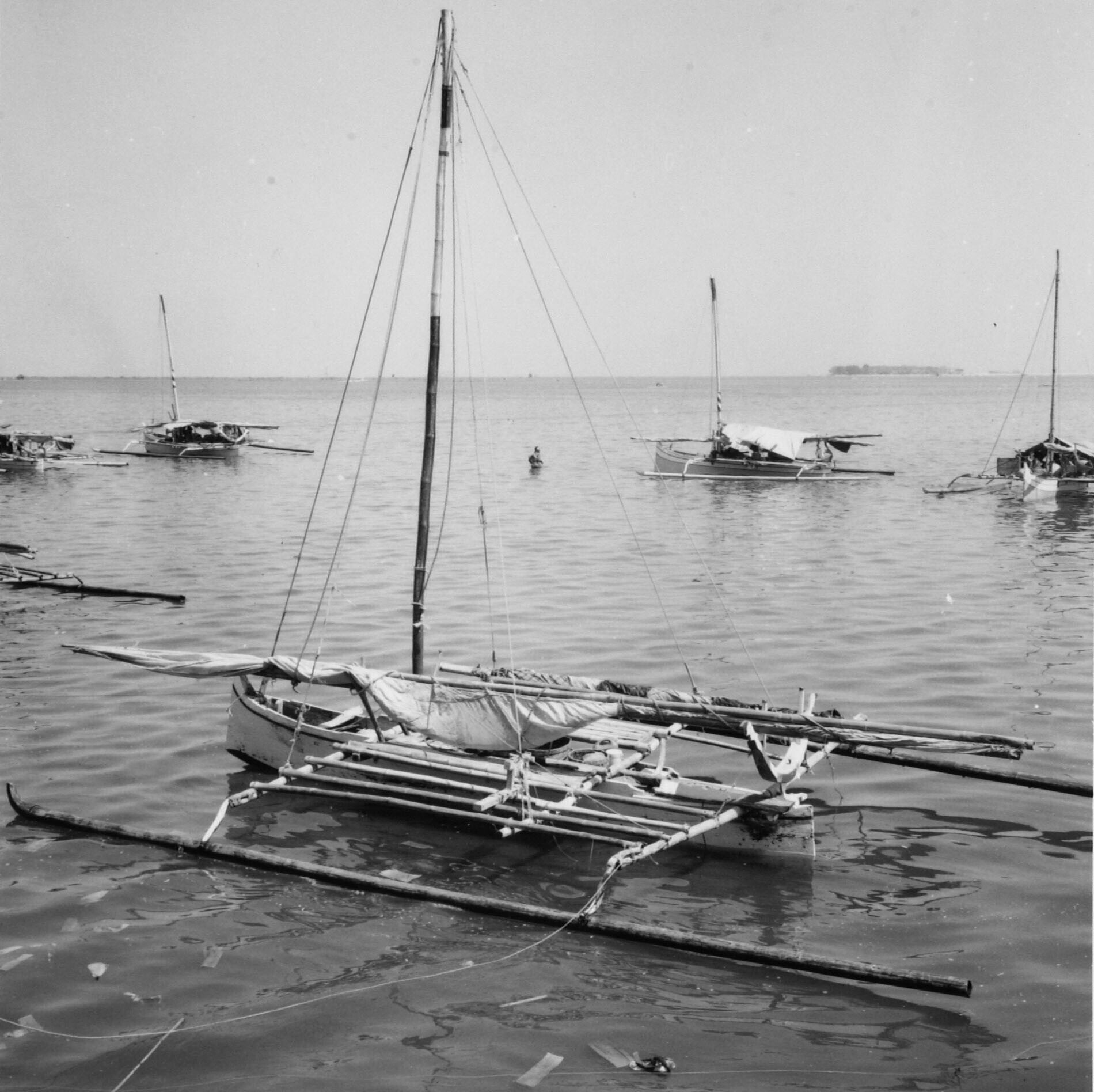 Een kleine vissersprauw ten anker bij de pasar ikan
