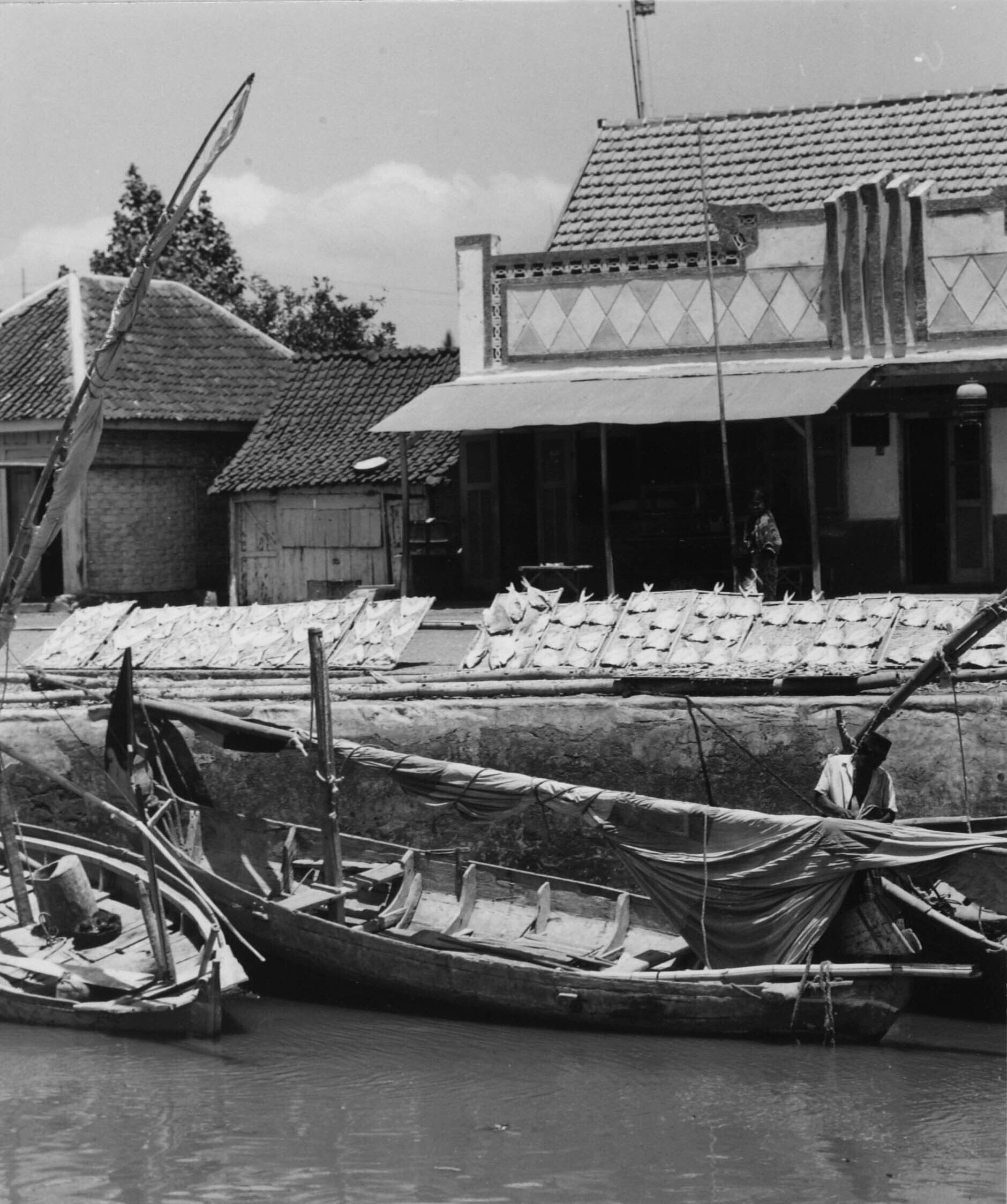 Vissersprauwen in het kanaal, op de wal wordt langs de straat vis gedroogd in de zon