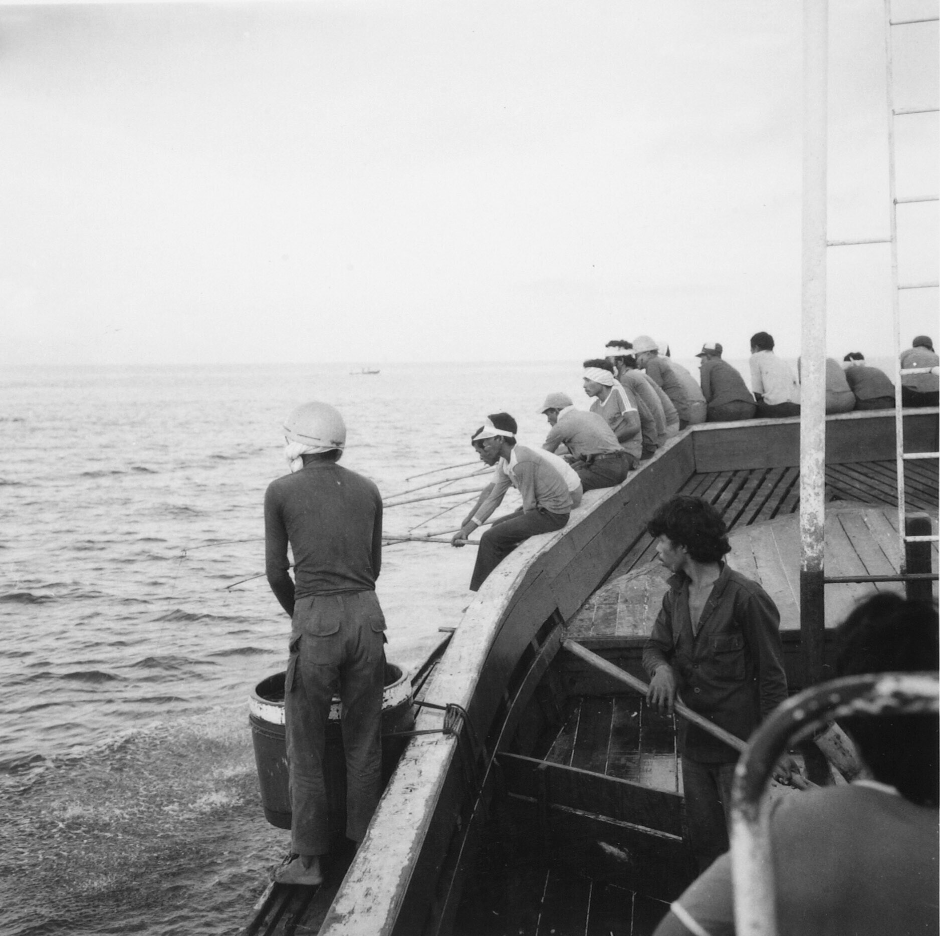 Vissersboot temidden van een school tonijnen, de aasvisjes worden uitgestrooid en gespannen wacht men de vangst af
