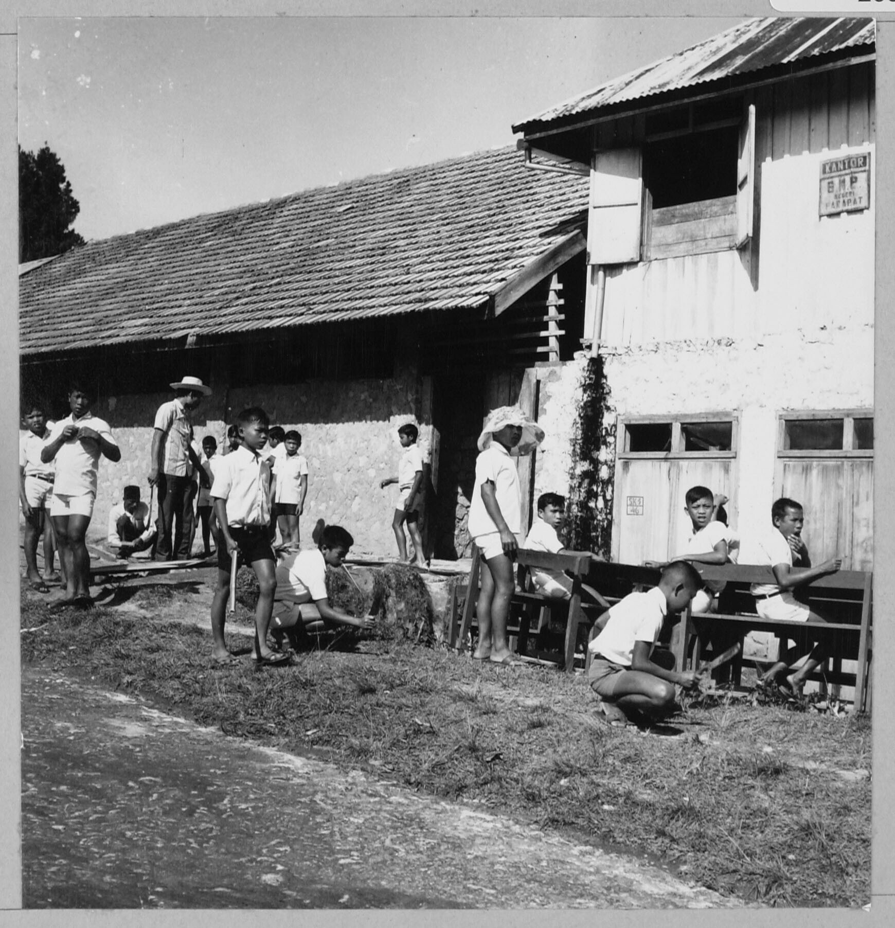 Schoolkinderen zijn bezig hun school en het terrein er omheen een fatsoenlijk aanzien te geven volgens het zogenaamde goton rojong '=samen iets doen' principe
