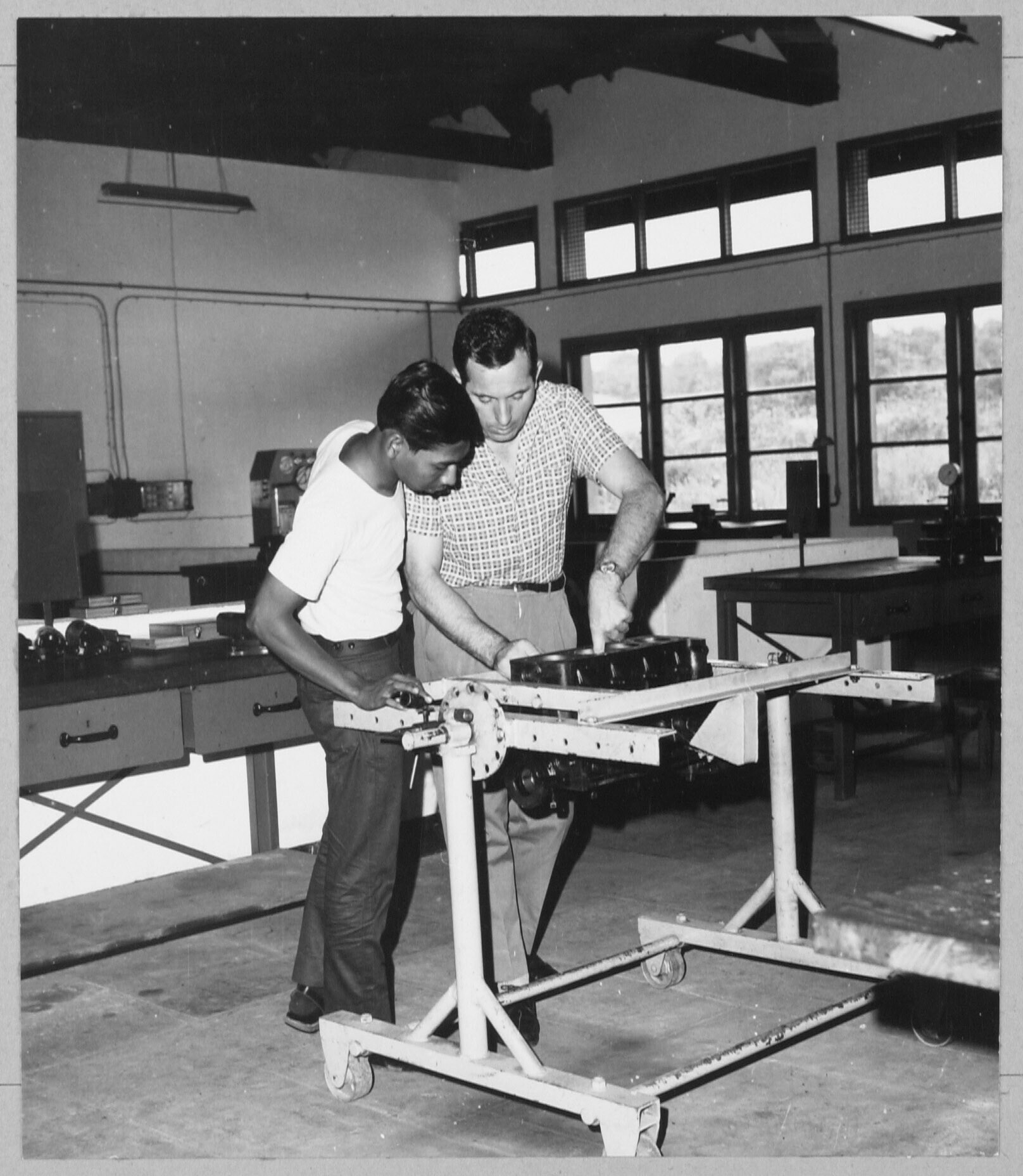 Nationale Industrieschool Sectie autotechniek, een Duitse leraar geeft aanwijzingen