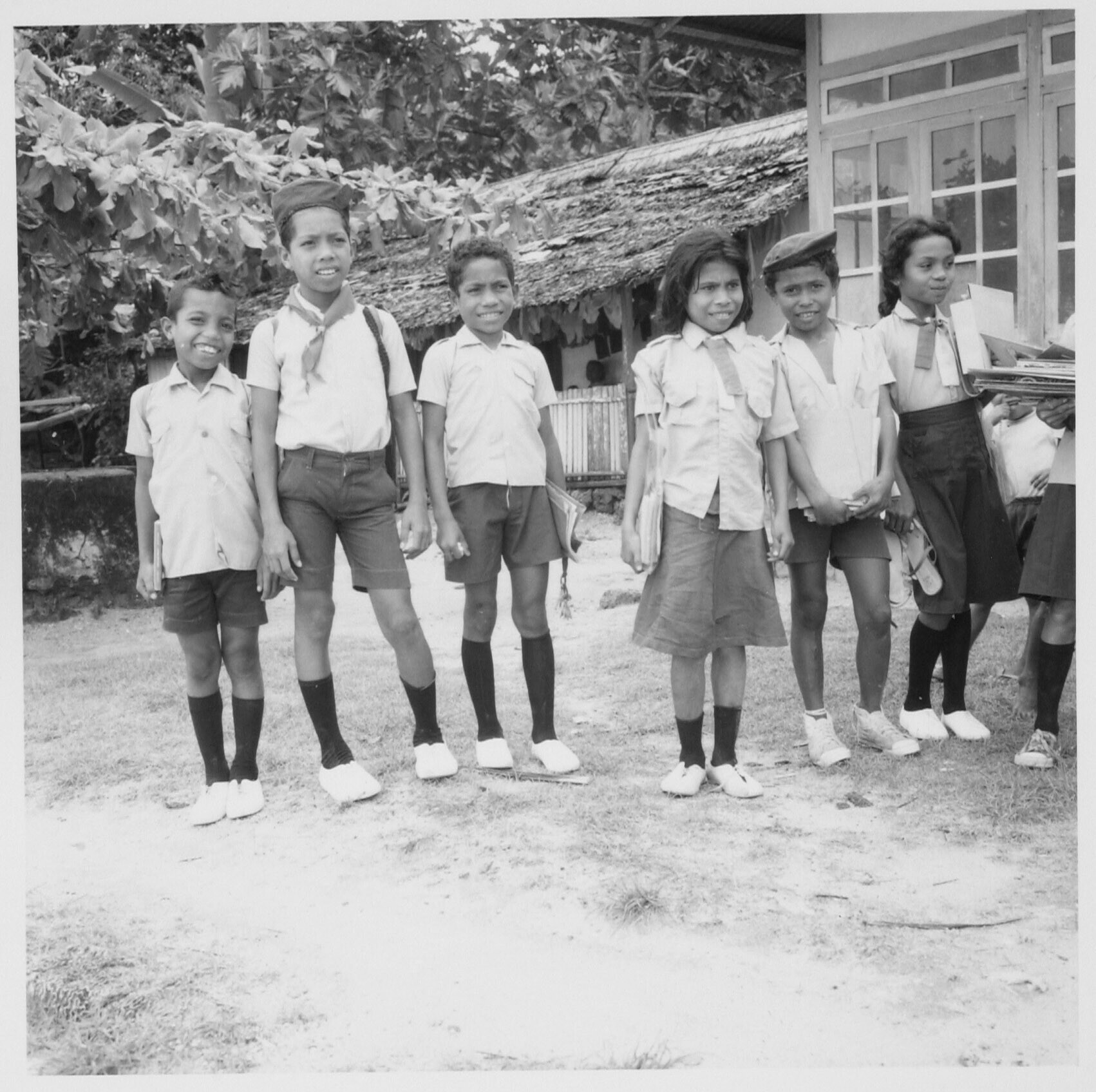Novi Sapulete onderweg naar school met enige vriendjes en vriendinnetjes, op vrijdag heeft iedereen in geheel Indonesië zijn padvindersuniform aan