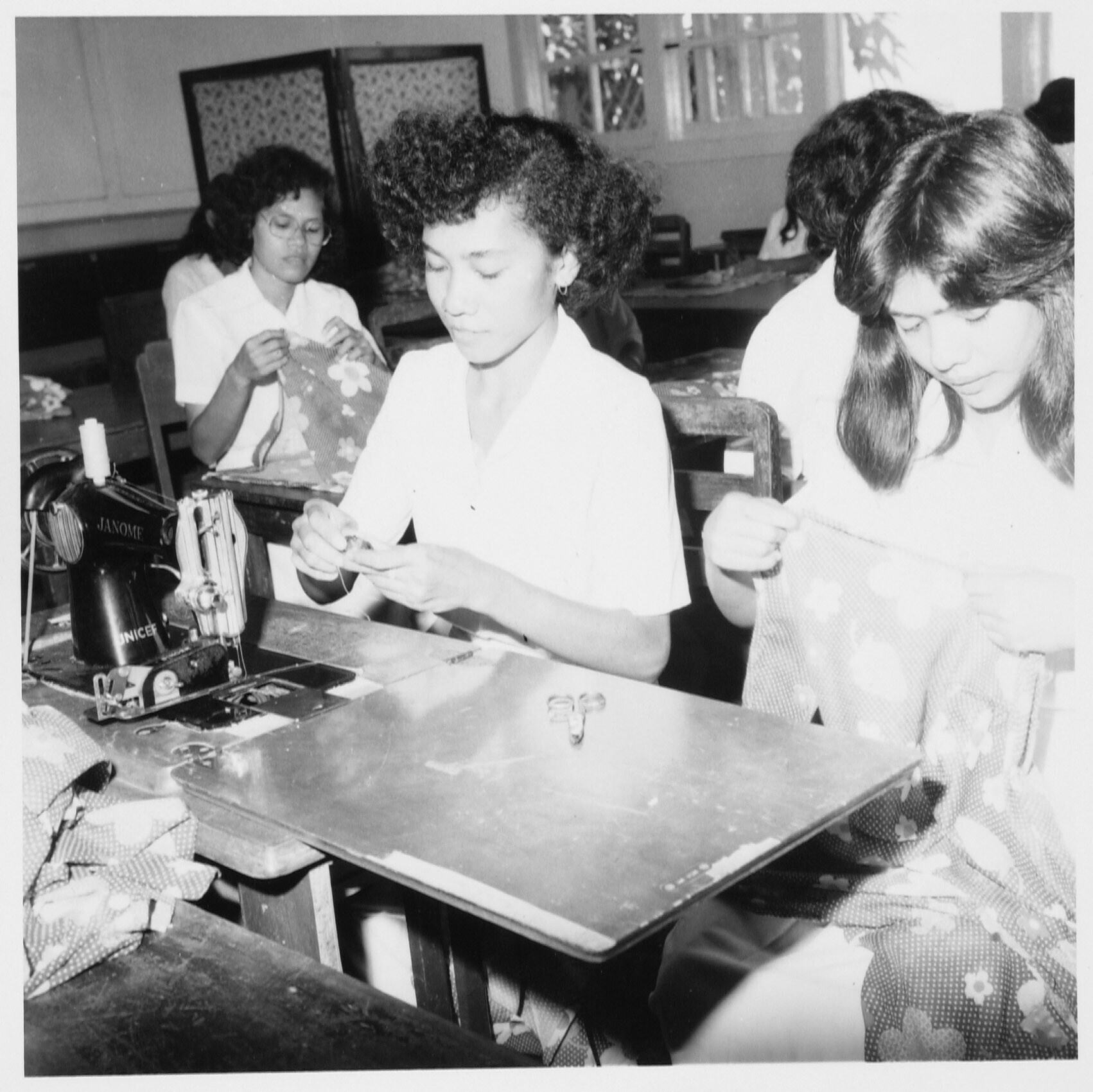 Meisjes van de huishoudschool tijdens de naailes