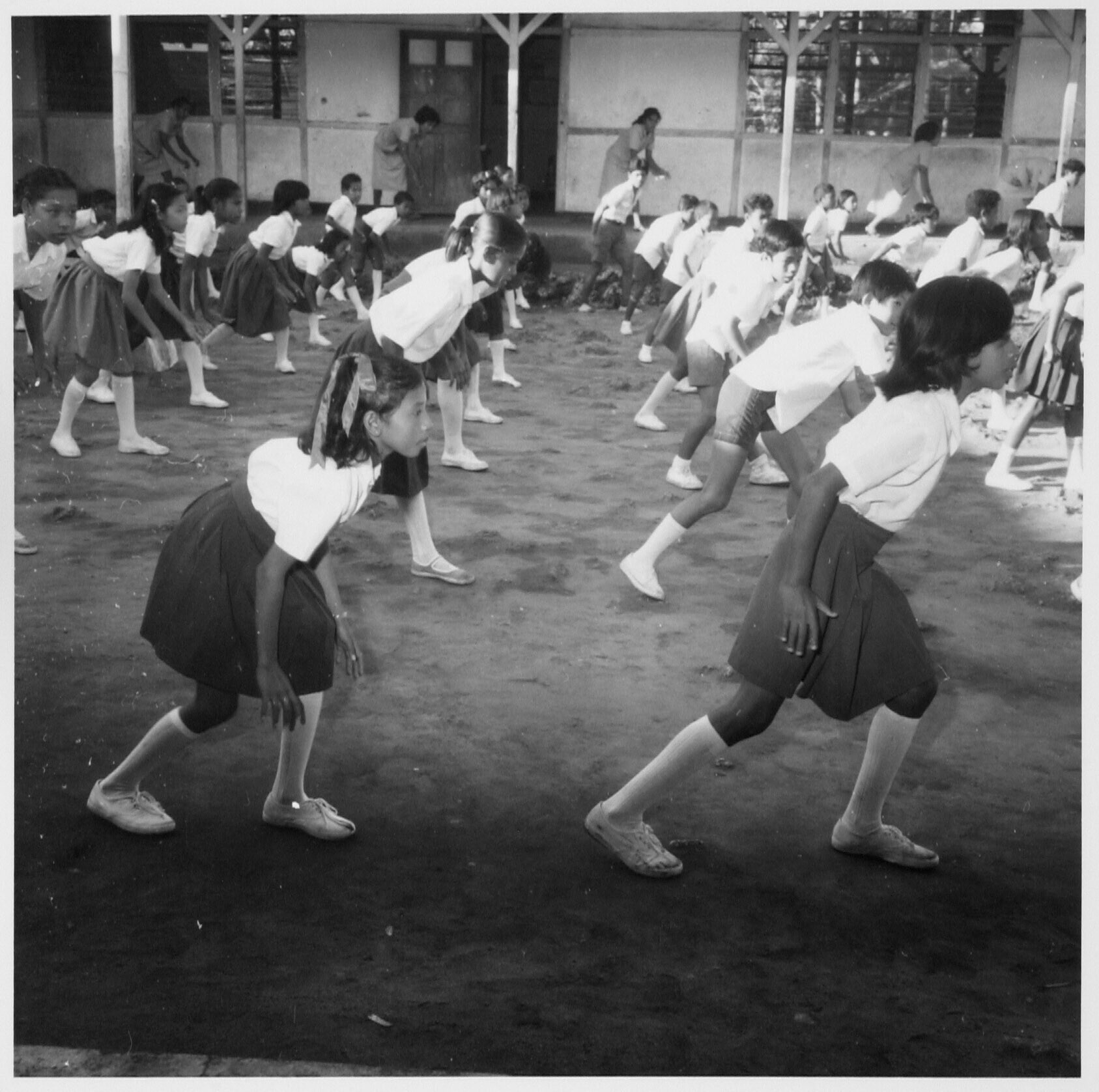 Latipa met haar schoolgenoten bezig met dagelijke ochtendgymnastiek