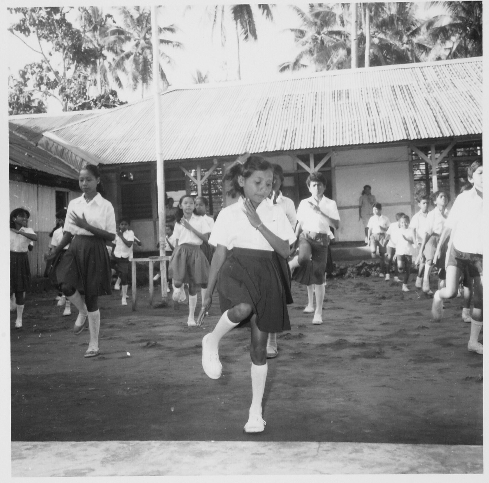 Latipa met haar schoolgenoten bezig met de dagelijkse ochtendgymnatiek