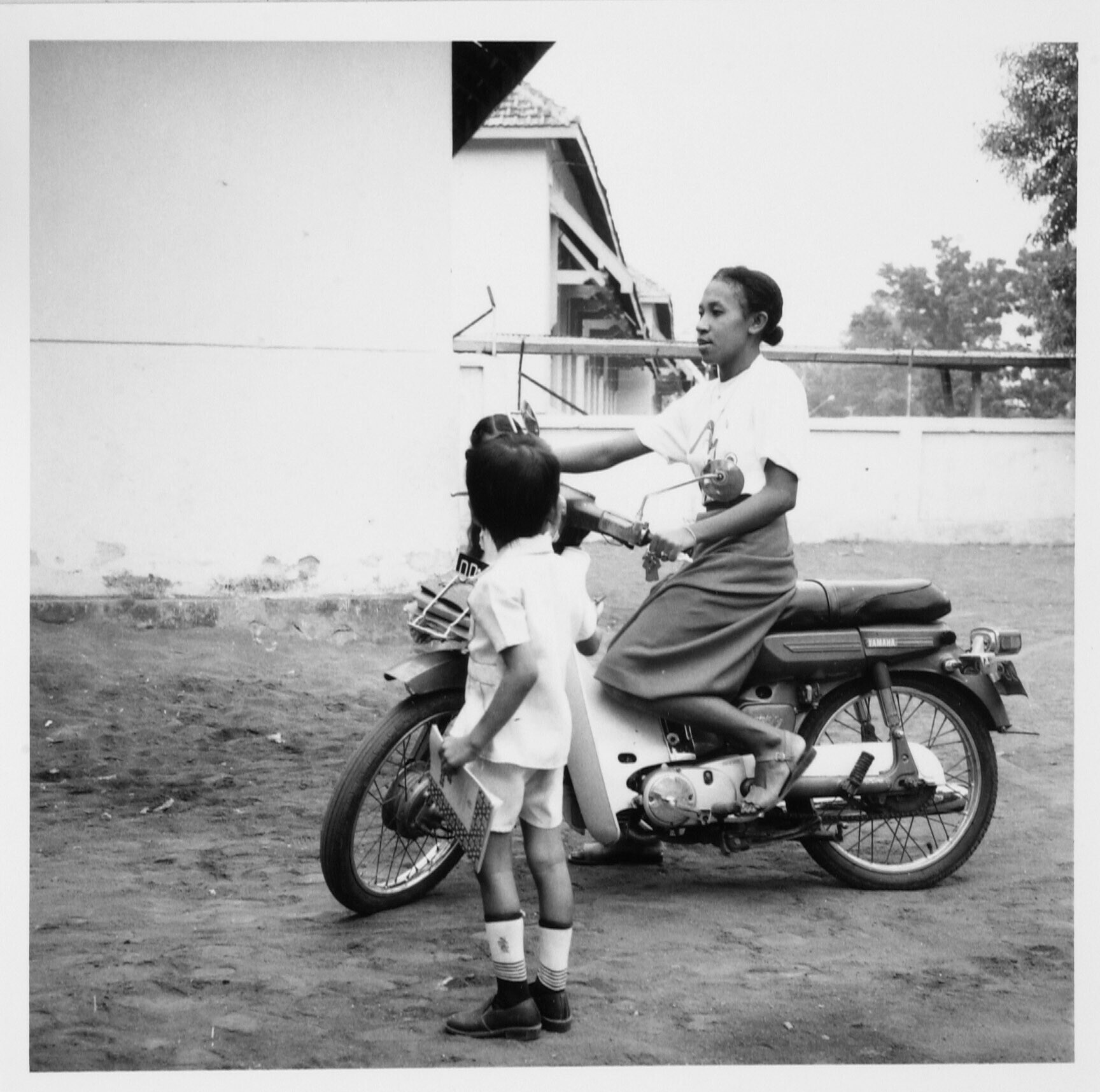 Een jongetje wordt door een familielid op een brommer naar de zondagschool gebracht