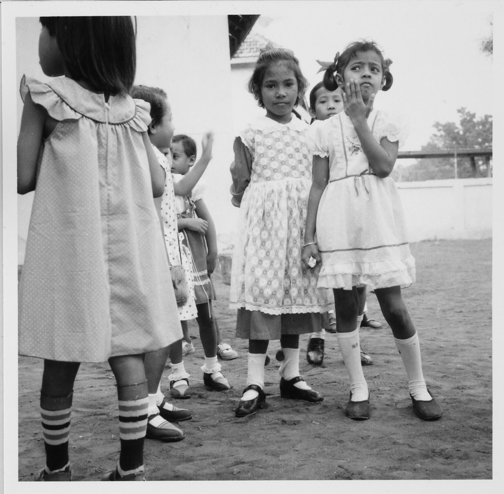 Kinderen in hun zondagse kleren voor de ingang van de zondagschool