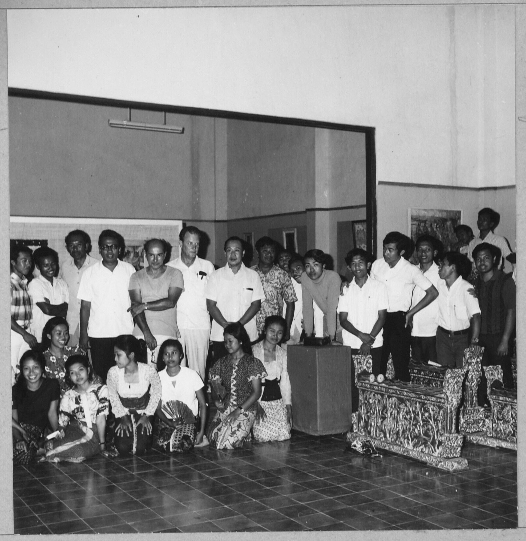Een leerling van de Akademie Seni Tara Indonesia, rechts het gamelanorkest