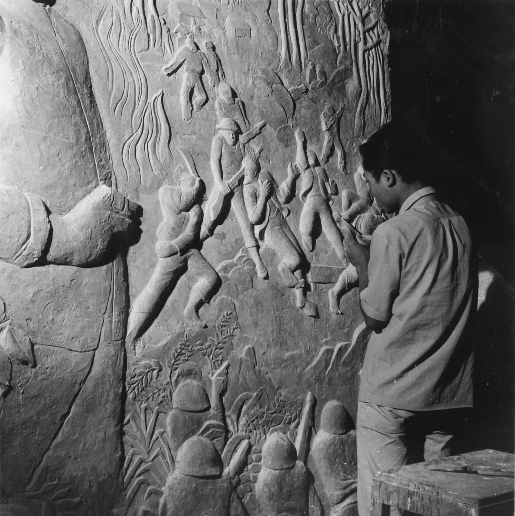 Akademie voor Beeldende kunsten ( Akademie Seni Rupa Indonesia, ASRI ) Leering van de beeldhouwwklas bezig met een reliëfonwerp