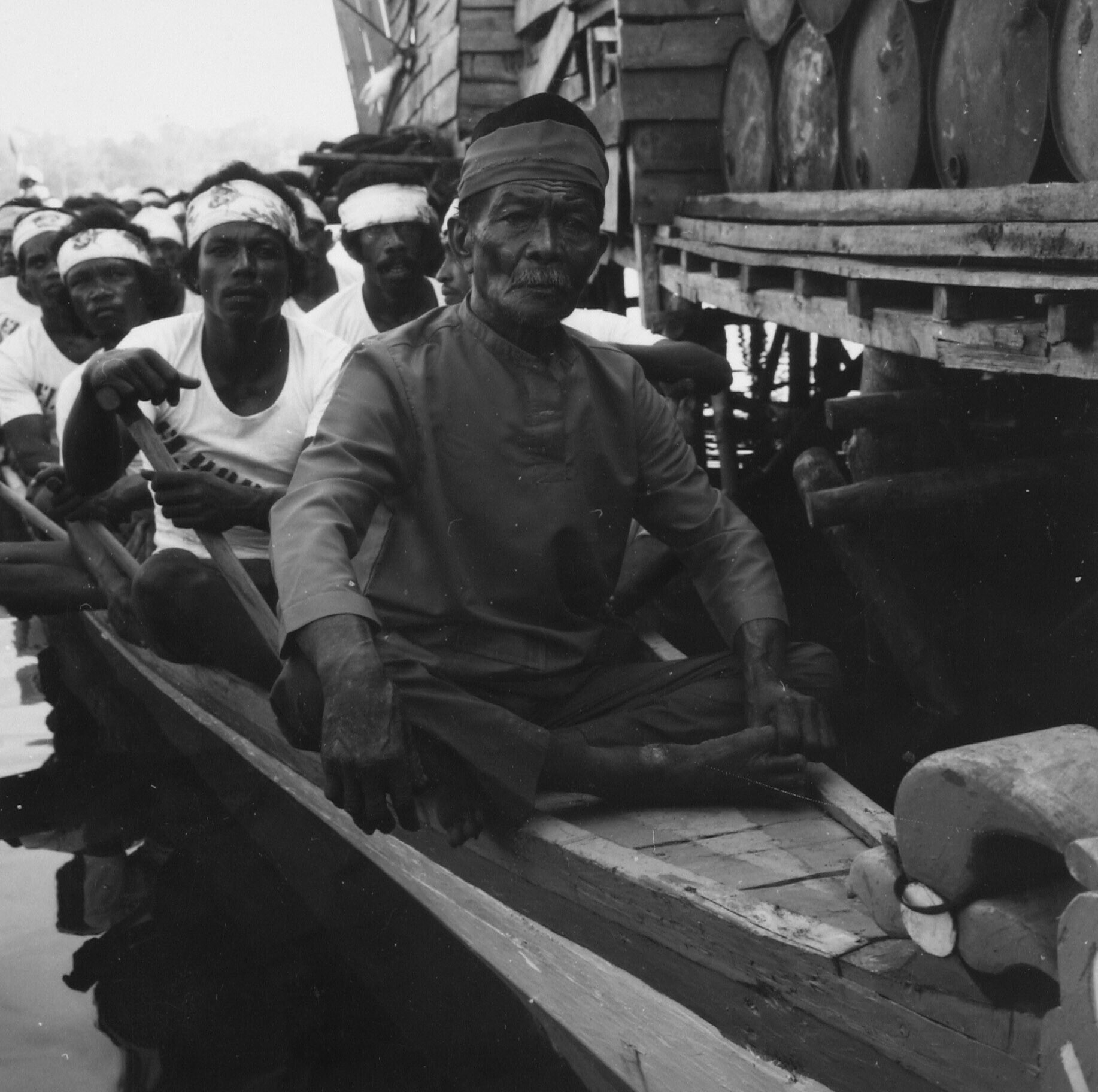 Aankomst van een wedstrijdprauw in de haven, de Bapa raja zit op de voorplecht