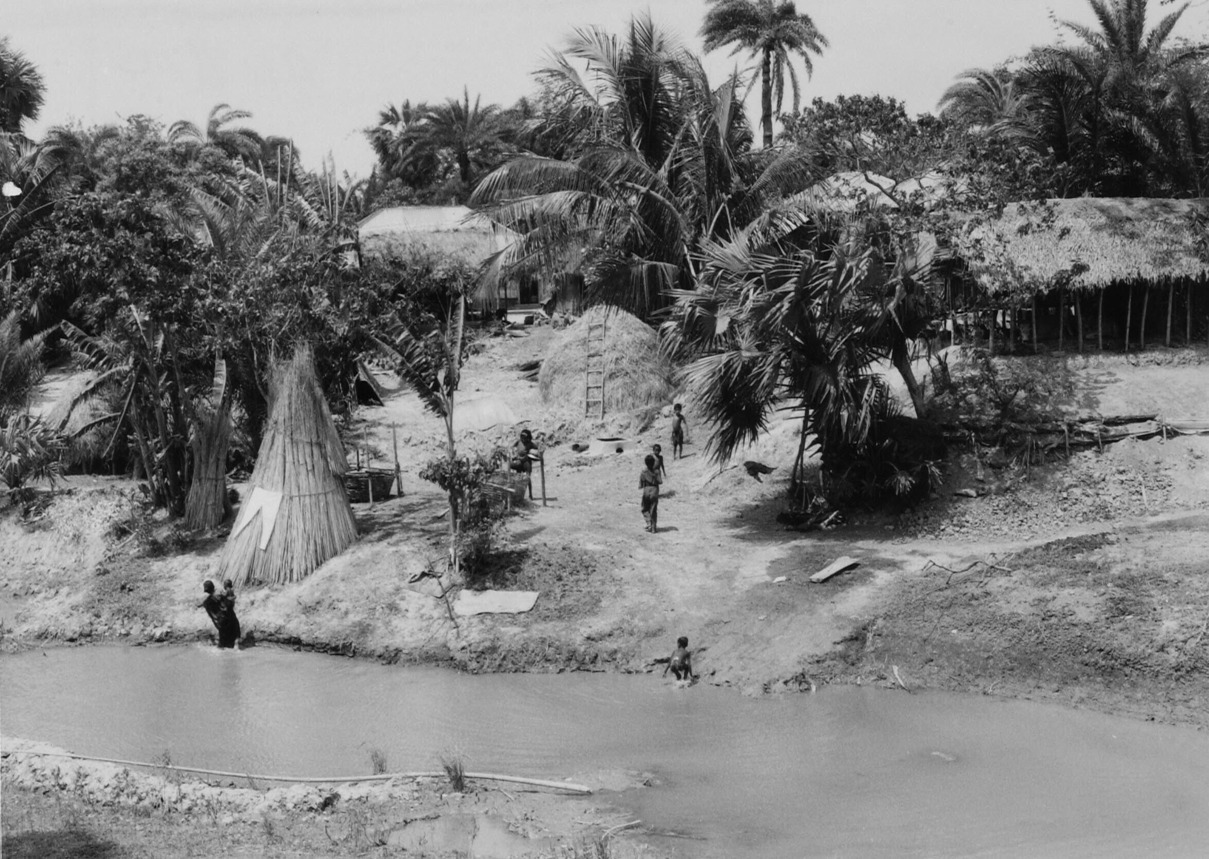 Dorpje met vijver met badende mensen, op de oever put, rijstopslag en stal