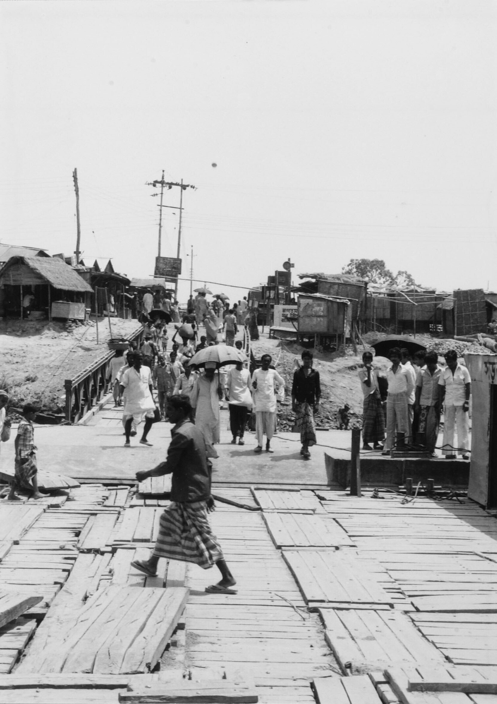 Mensen verlaten de ponton nadat de brugverbinding tot stand is gebracht