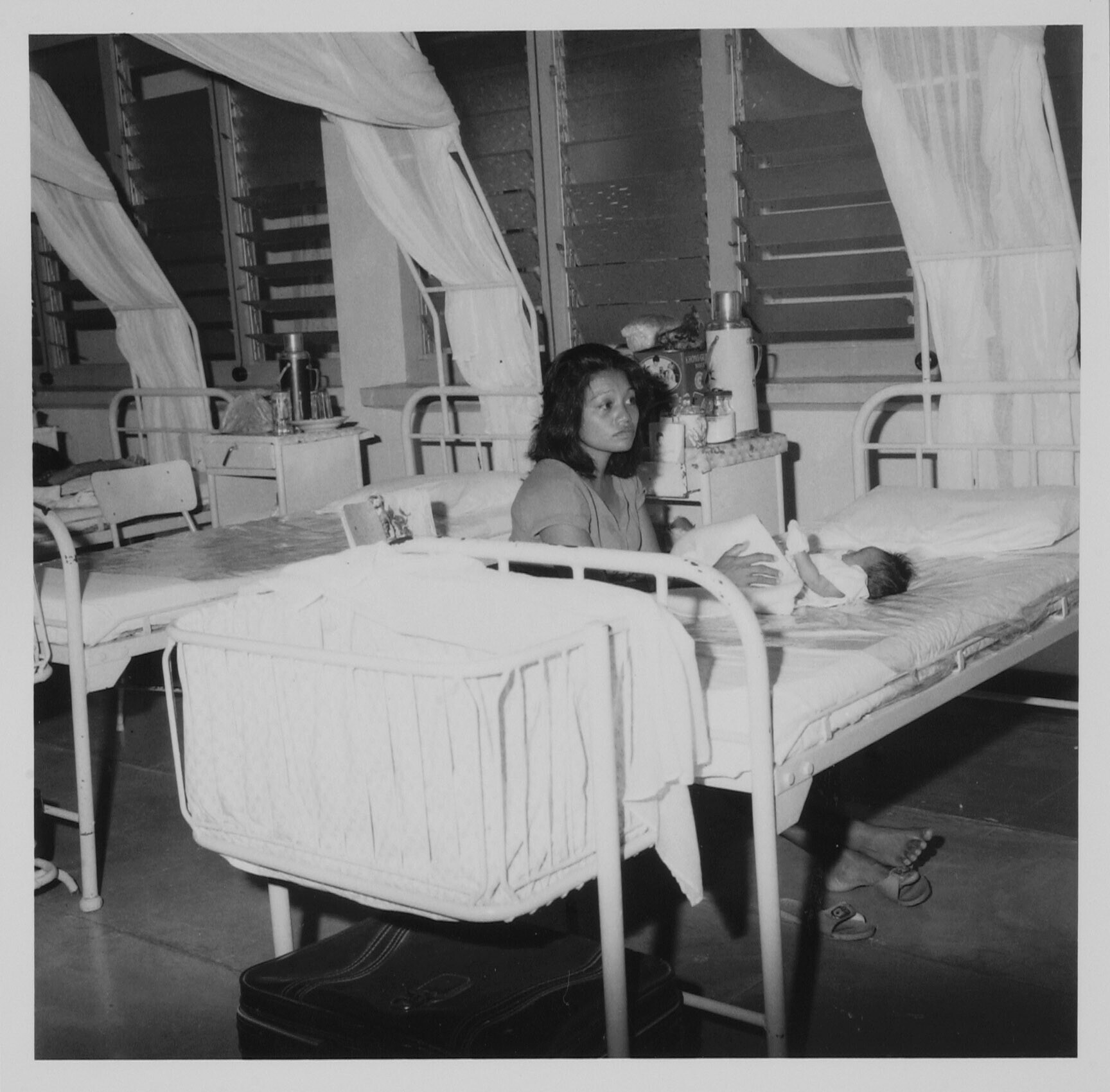Een vrouw wacht met haar baby op het moment dat zij de baby kan gaan baden in het Otto Kuyk Centrum