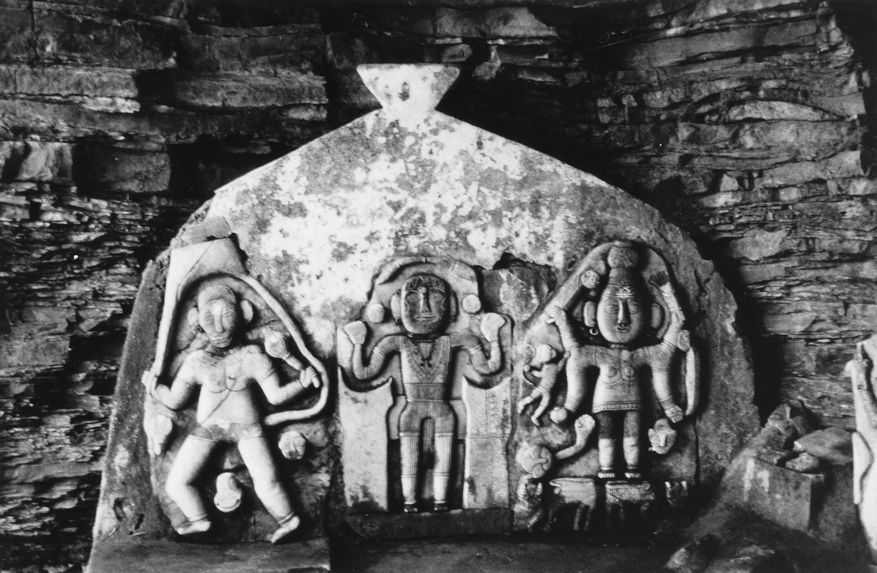 Een van de ontwerpers van het Weavers Art Center aan het werk, boven hem hangen enige ontwerpen