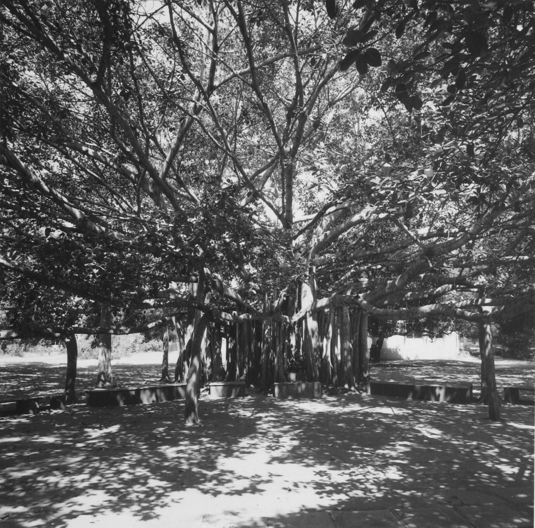 De grote waringin boom op het terrein van de College og Fine Arts Kalakshetra waaronder elke ochtend de dagopening plaatsvindt