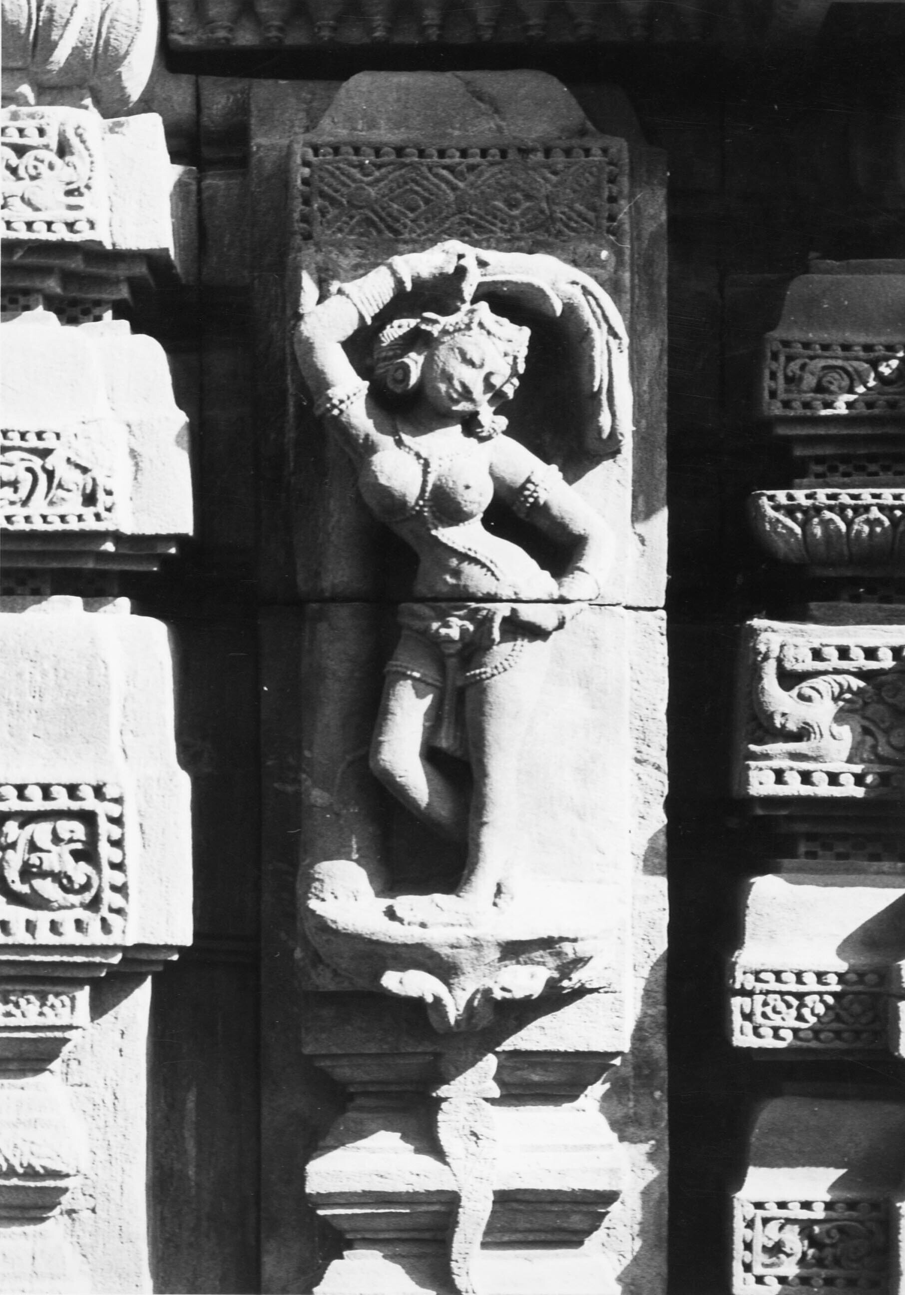 Een detail van de muur met sculpturen welke beschadigd zijn door verwering en vandalisme in de Zonnetempel