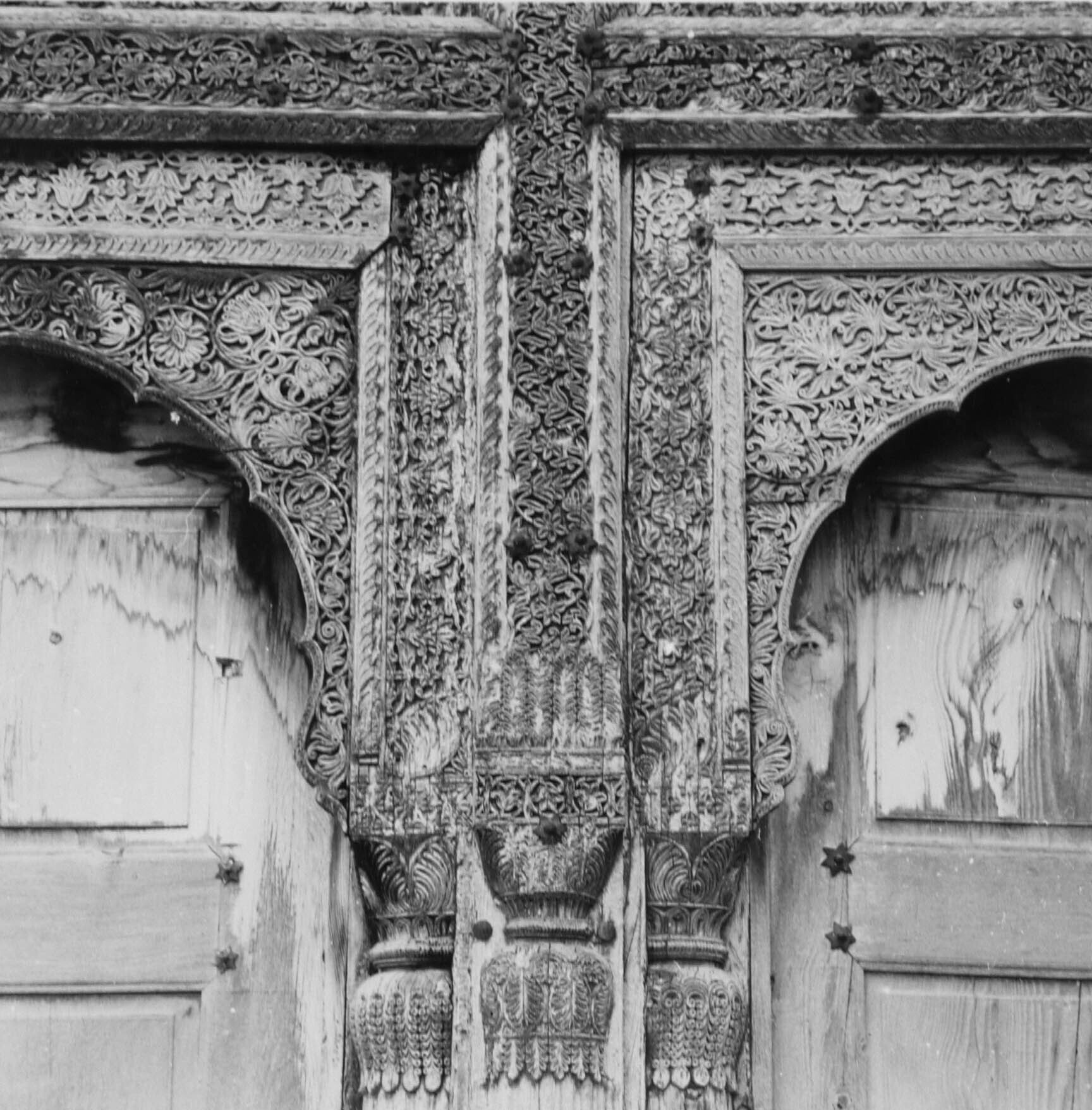 Dorp Wah (ca. 25 km. ten W. van Rawalpindi). Detail van een woonhuis waarvan de deuren voorzien zijn van fraai houtensnijwerk
