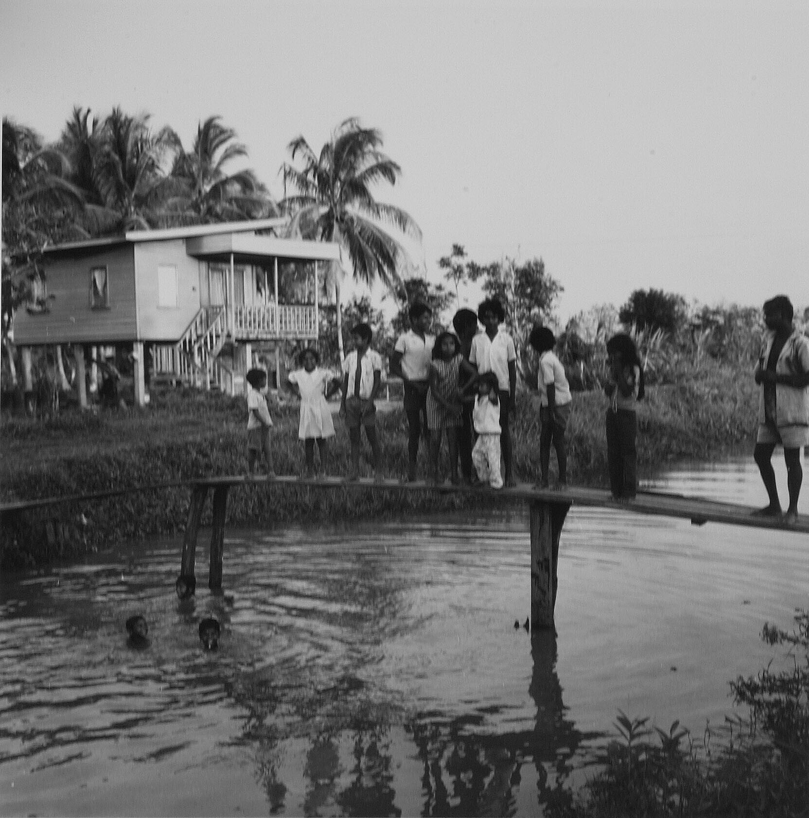 Hindoestaanse kinderen aan Leiding 16,op de achtergrond woning van een Hindoestaanse landbouwer