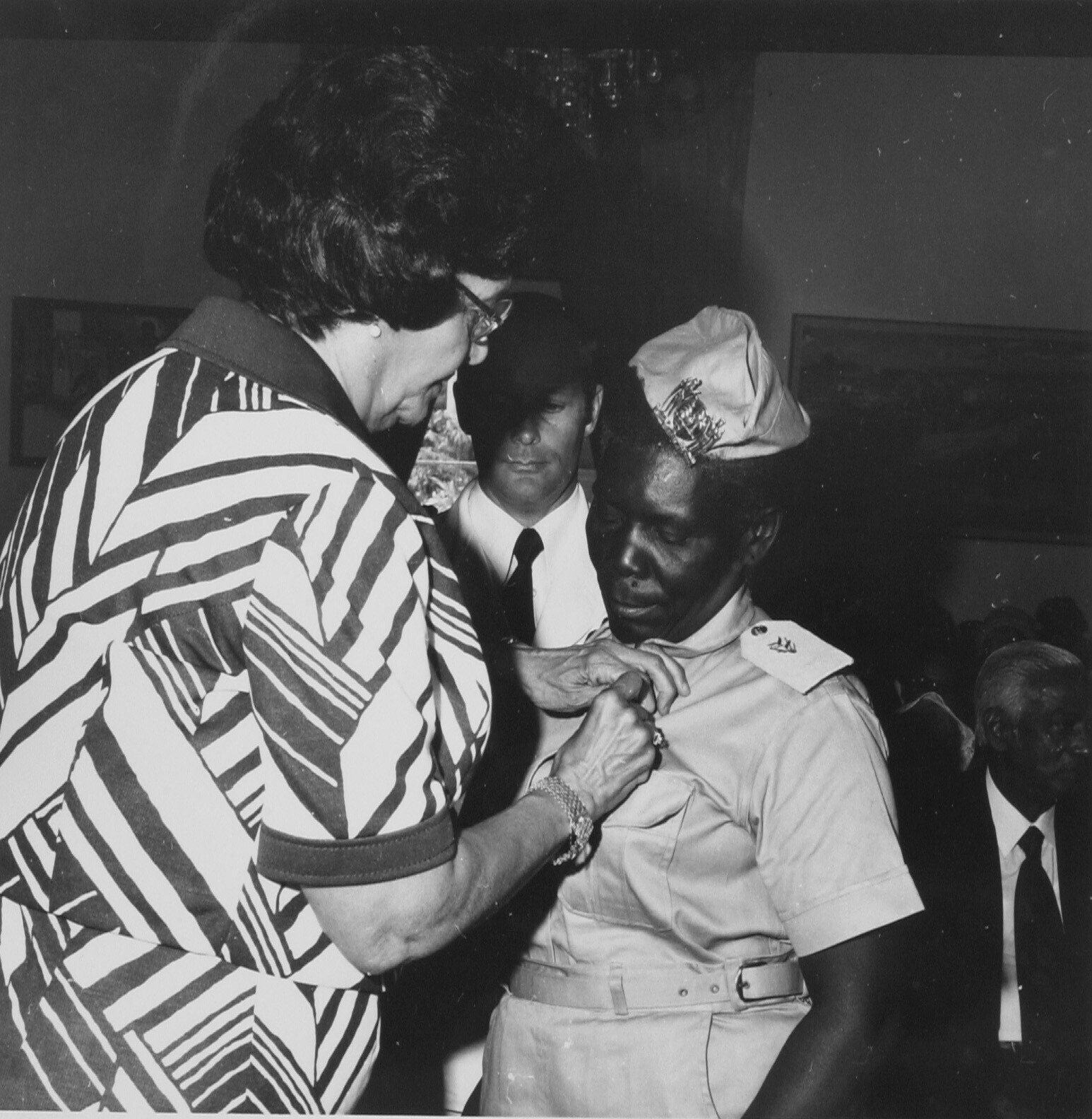 Bosnegervrouw die hier een koninklijke onderscheiding opgespeld krijgt door de echtgenote van gouverneur Ferrier