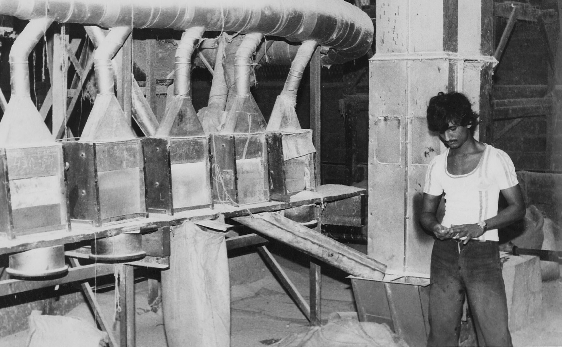 Illegale Guyanees aan het werk voor rijst-sorteermachine in fabriek