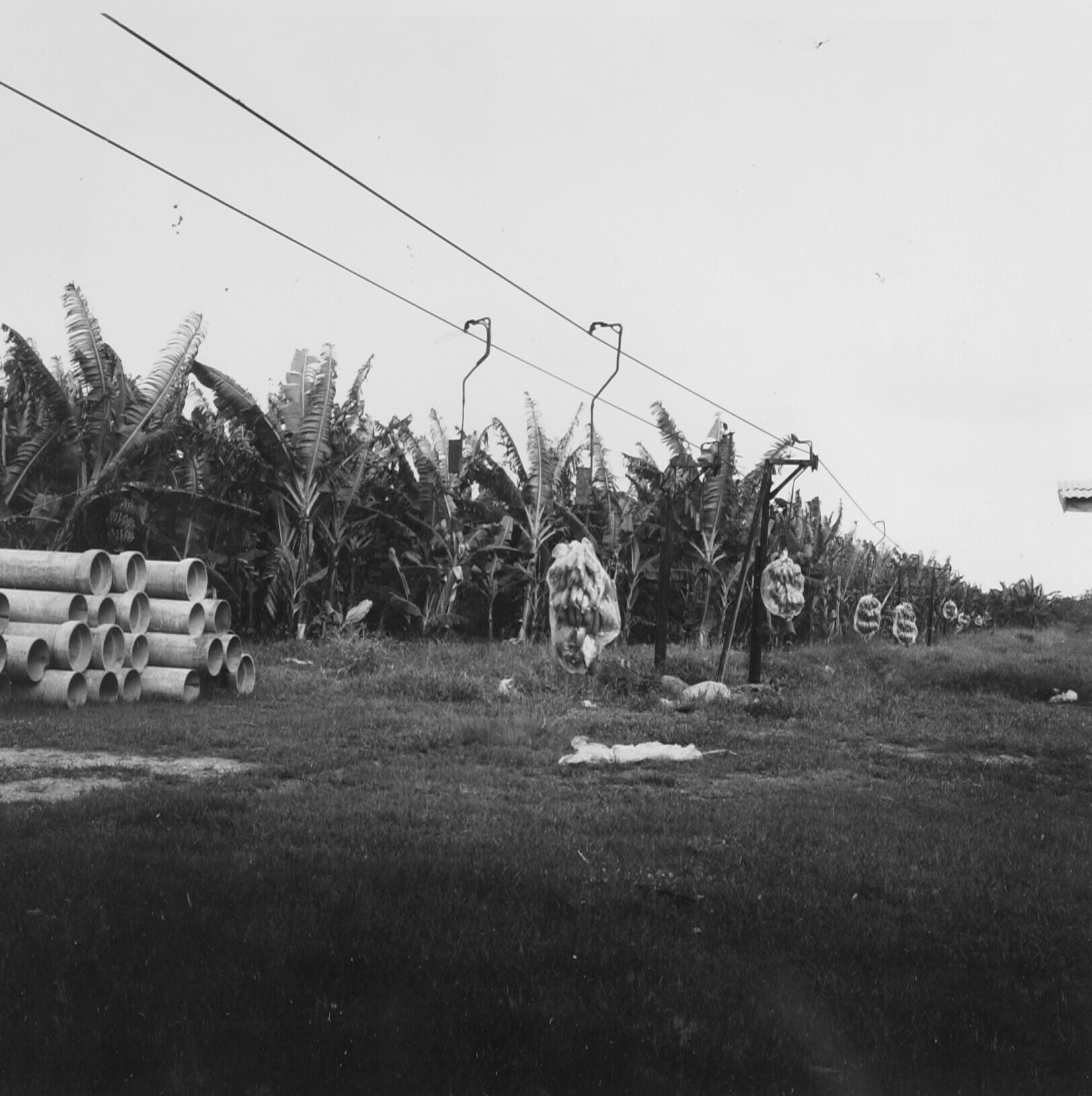 Bakovencultuur. Aanvoer van de geoogste trossen per kabelbaan
