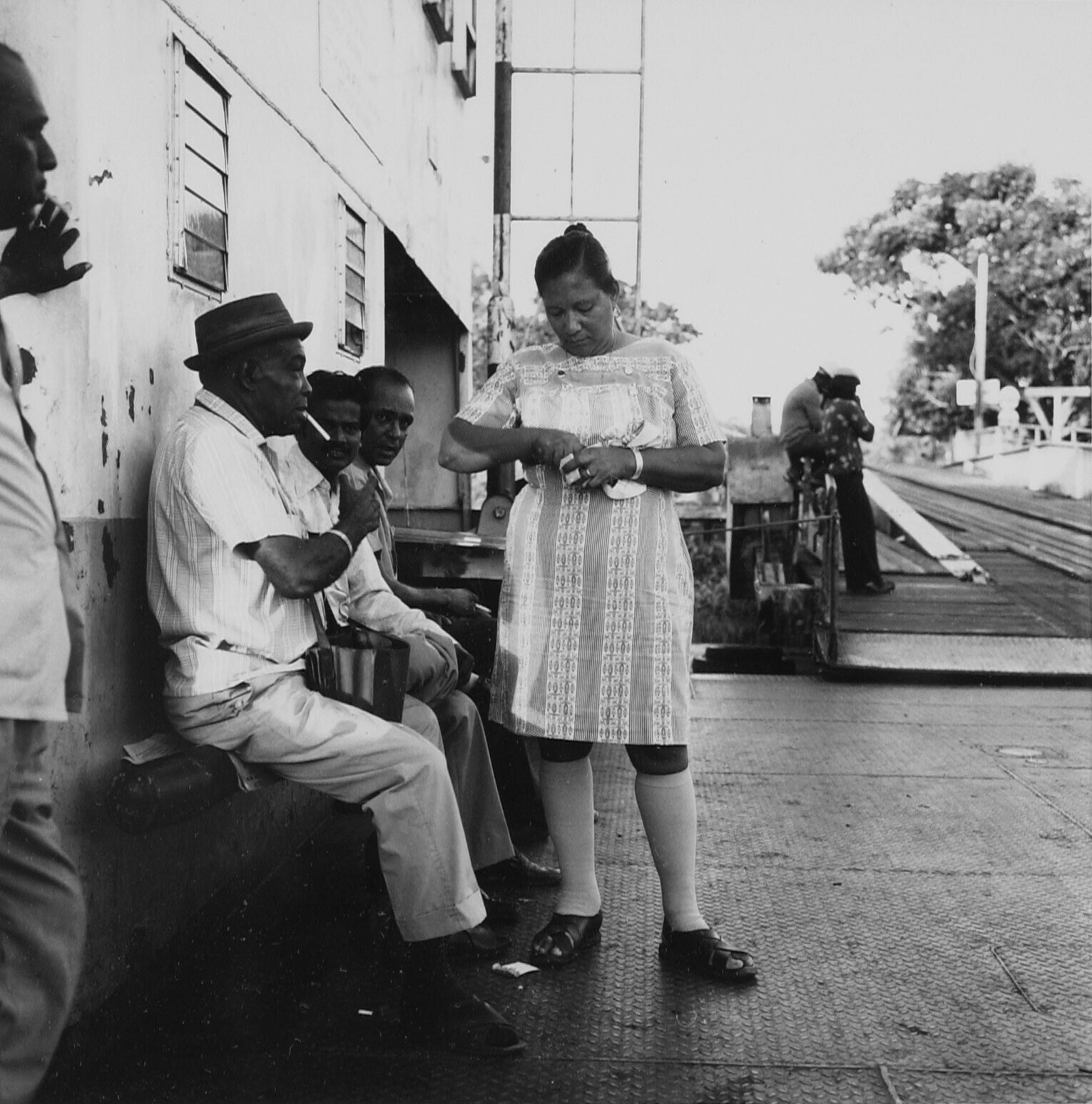 Veerboot van de Commewijne rivier. De veerman heeft het zich gemakkelijk gemaakt
