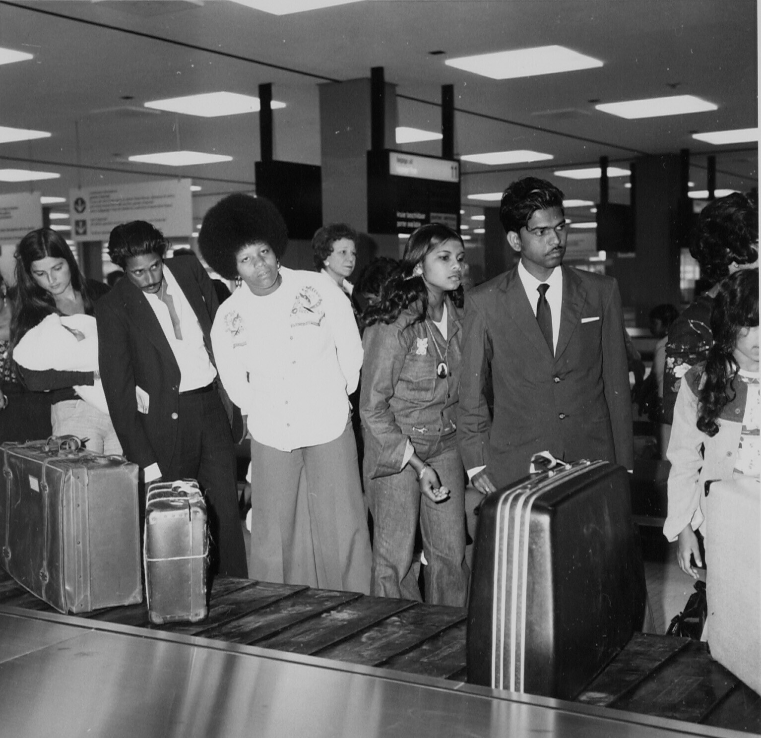 Aankomst Surinamers op Schiphol; wachtend op de bagage