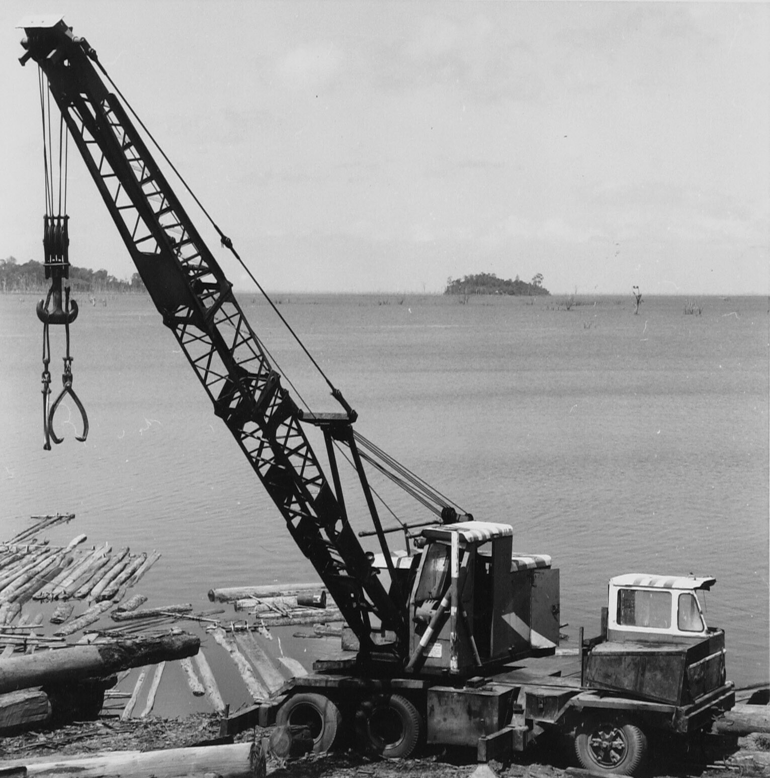 Van Blommensteynmeer - Deze kraanwagen sleept de aangevoerde boomstammen hardhout het land op. Achter de dam worden ze in vlotten verder de rivier afgevoerd