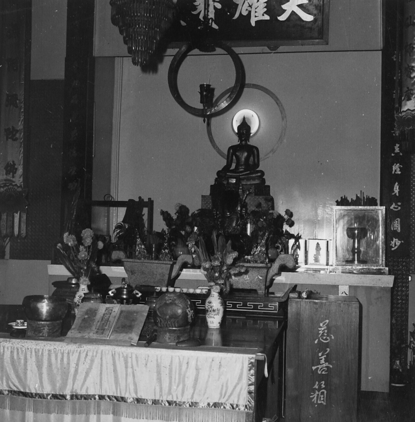 Hoofdaltaar met een 'Thais'Boeddhabeeld(!) in een Chinese tempel in Chieng Mai. De Chinezen in Thailand vormen in economisch opzicht de belangrijkste minderheid. Het merendeel woont in de steden. Chieng Mai, N.Thailand.