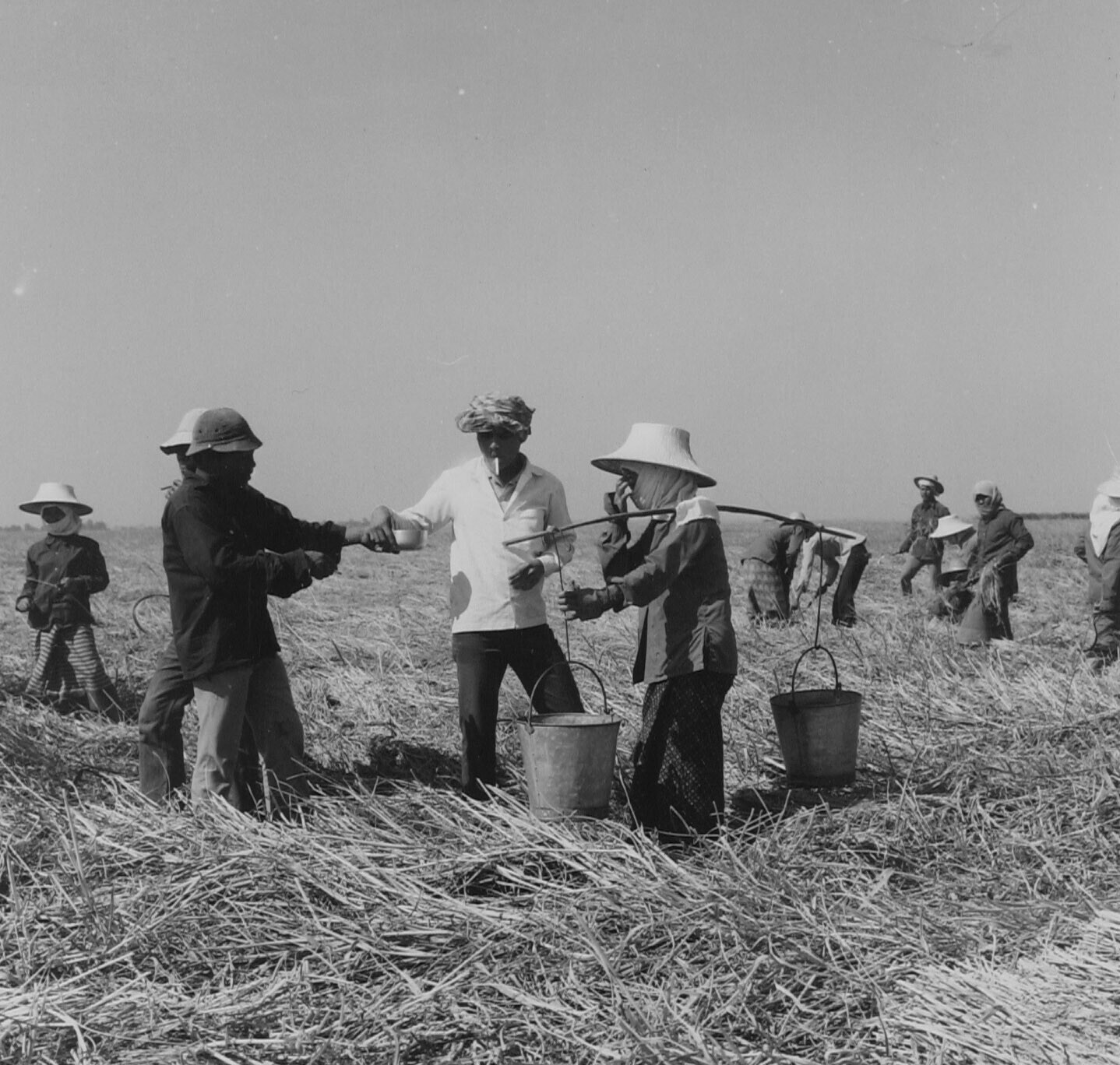 Gedurende het oogsten onder de gloeiende zon zorgen vrouwen er voor dat de dorstige kelen regelmatig worden gelaafd. Omgeveing Prek Sriracha, Centrale Vlakte.