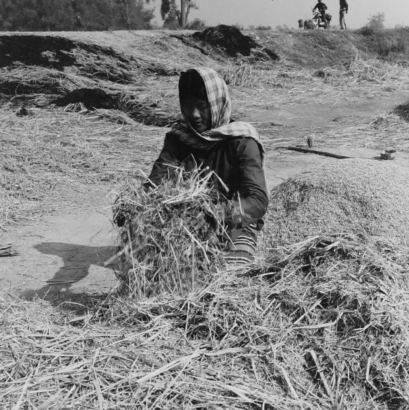 Na het dorsen worden de overtollige rijsthalmen (rijststro) verwijderd. Singburi, Centrale Vlakte.