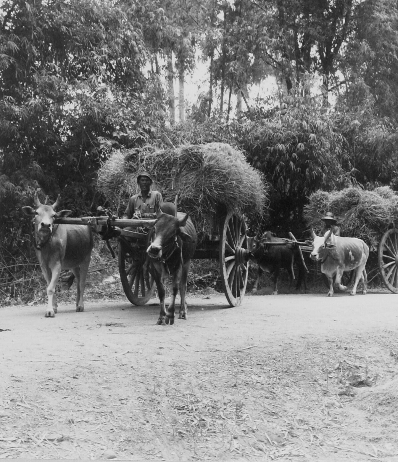 De geoogste rijst wordt nog overwegend per ossekar naar het dorp vervoerd. Hué Krot, Centrale vlakte.