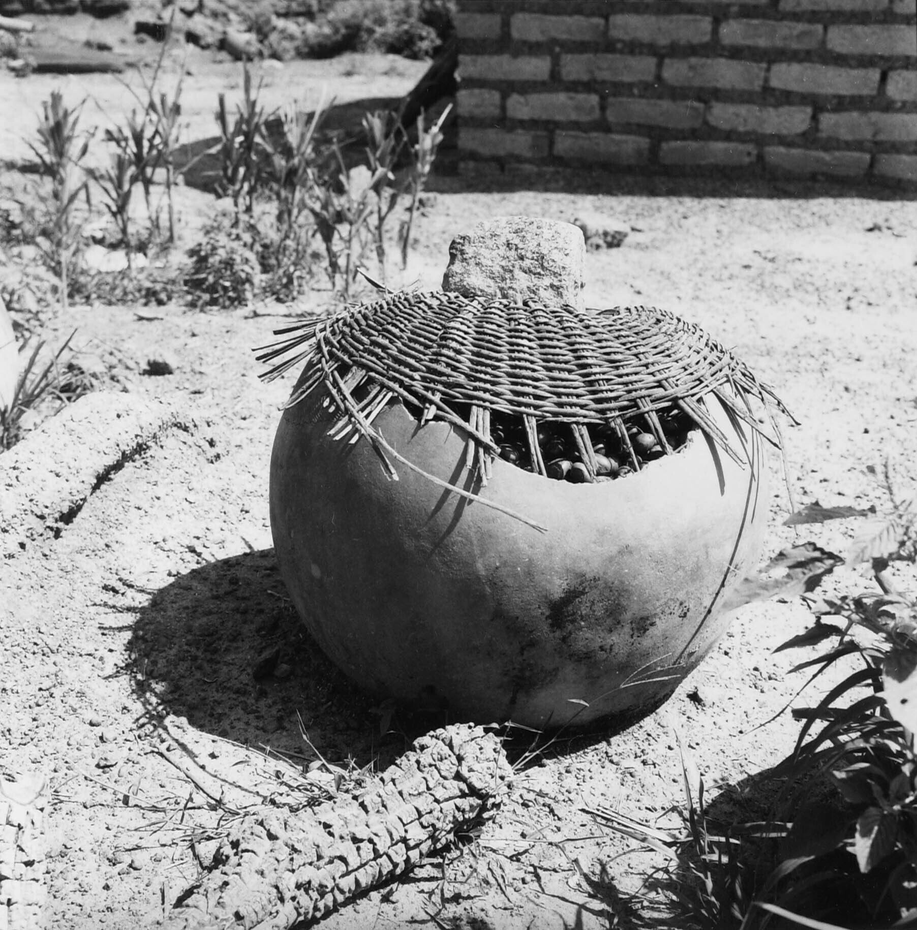 Een kalebaspot vol kariténoten afgedekt met een gevlochten deksel en een steen