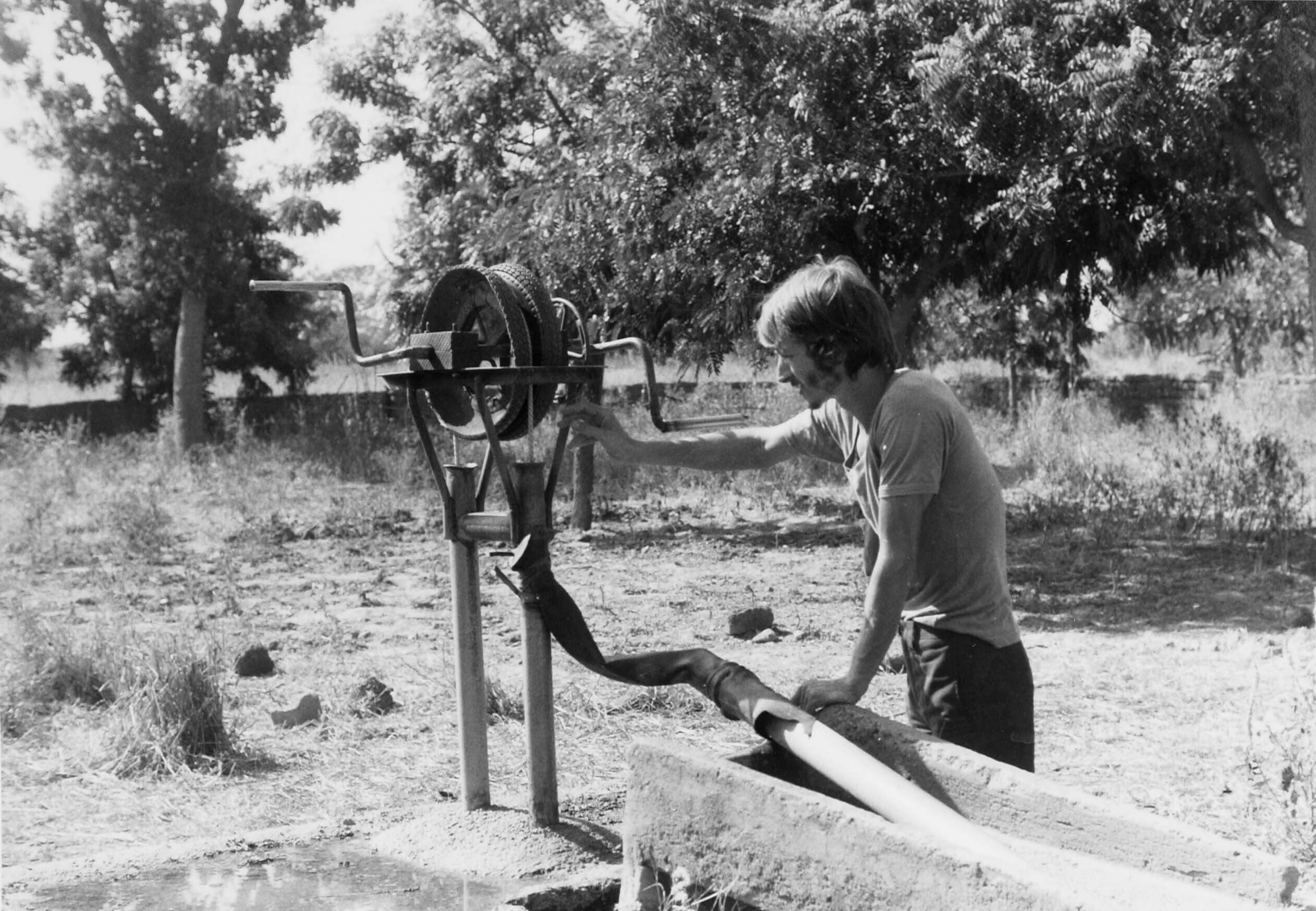 Een expert van Demotech bij een door hem ontwikkelde waterpomp in de regio van Ouargaye in het zuiden van Burkina Faso