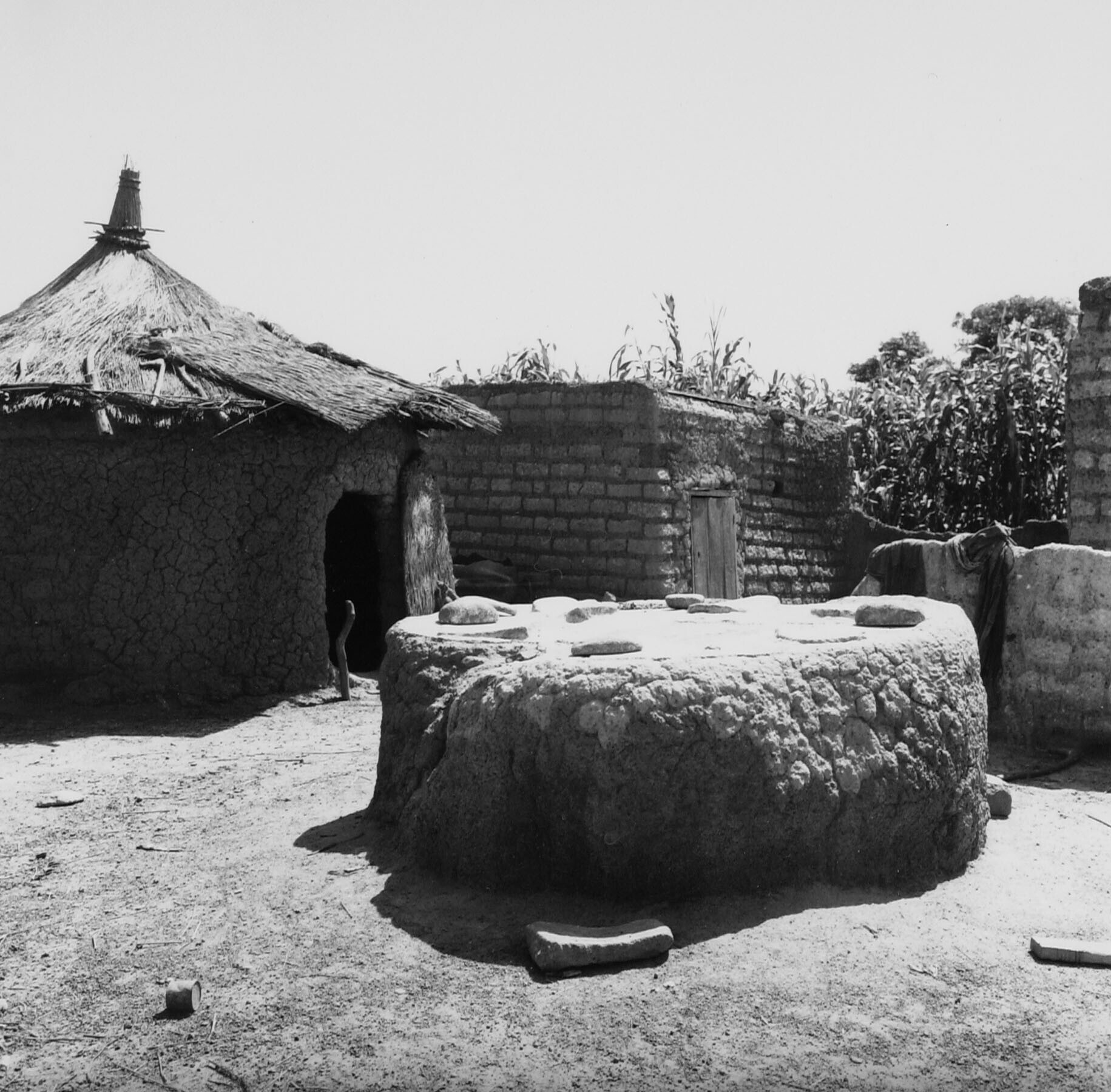 Zicht op een erf van een Mossi dorp met op de voorgrond een verhoging met wrijfstenen voor de voedselbereiding