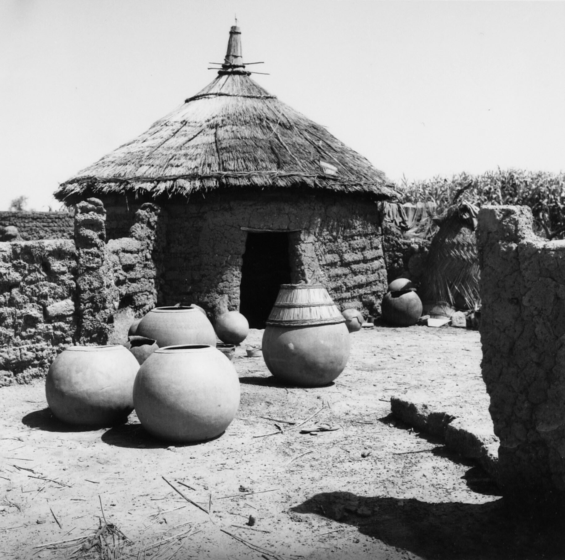 Zicht op een Mossi erf met op de voorgrond enkele aardewerk potten