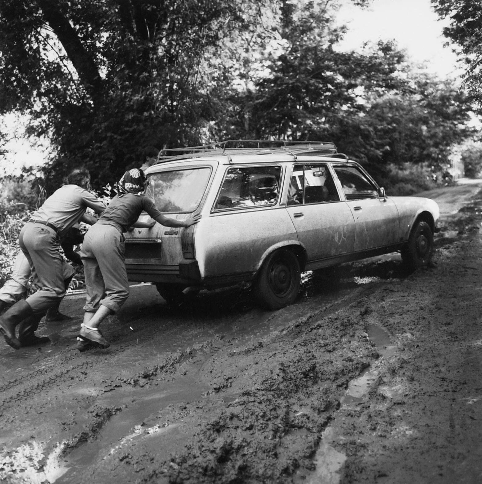 Het aanduwen van een auto die door de modder op de weg dreigt weg te slippen